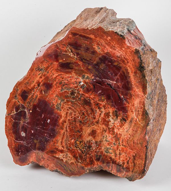 Partial Polished Petrified Wood Log Section. This large 10 x 9.5 x 5 inch deep partial log section ways over 37 pounds and is from the 225 million year old Chinle formation of northern Arizona, the same general area as the famous Petrified Forest National Park. Petrified (fossilized) wood was created when a forest of trees was buried in a volcanic eruption that enabled the wood to be gradually replaced by minerals in the ground water over many millions of years. This superb specimen known as Araucarioxylon arizonicum (the Arizona state flower) came from an extinct conifer tree and has a high polish on its top side with natural agatized color on the backside and with nearly complete bark on the sides. The color ranges from the rare orange, burnt orange to red with splashes of beige and purple. This agatized wood was created by ground water with various minerals slowly permeating the silica from the lava and replacing the wood grains of the wood.