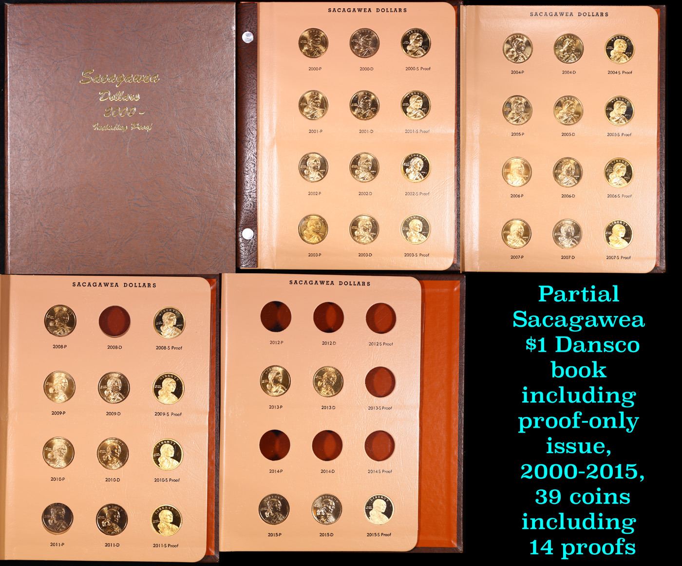 Partial Sacagawea $1 Dansco book including proof-only issue, 2000-2015, 39 coins including 14 proofs. All coins encased in a nice Dansco Sacagawea Dollars Book. Dates Range from 2000-2015. A fantastic grouping of 39 coins including 14 proof.