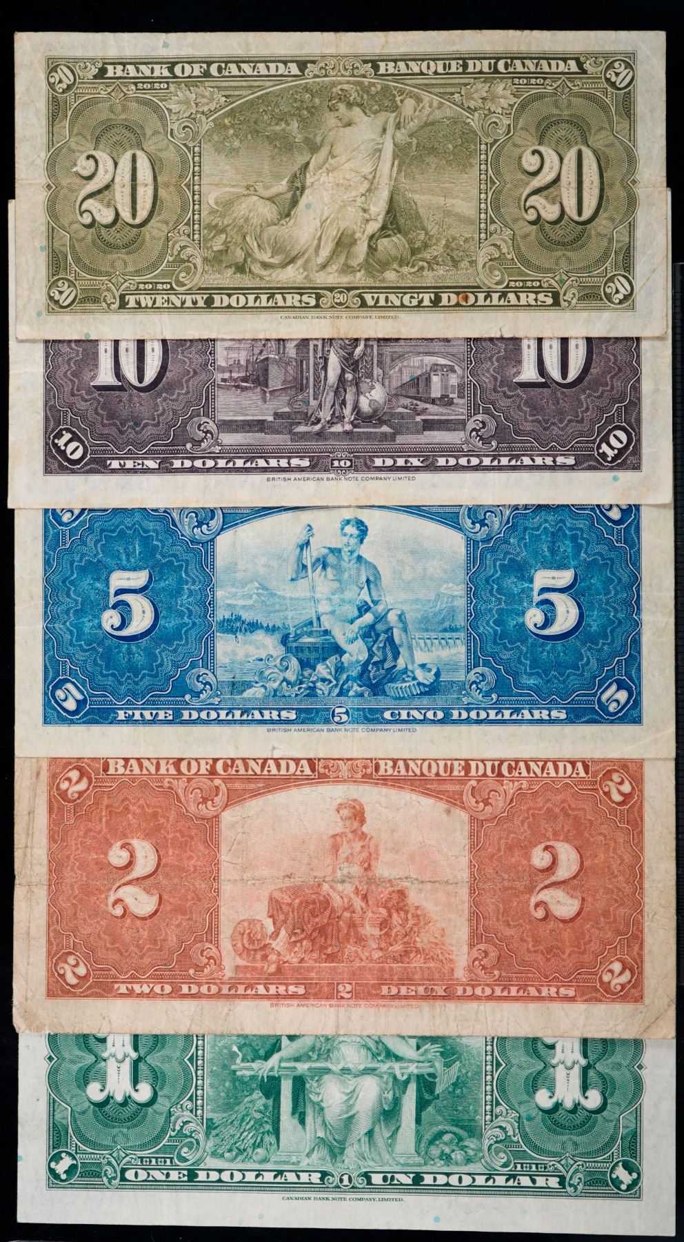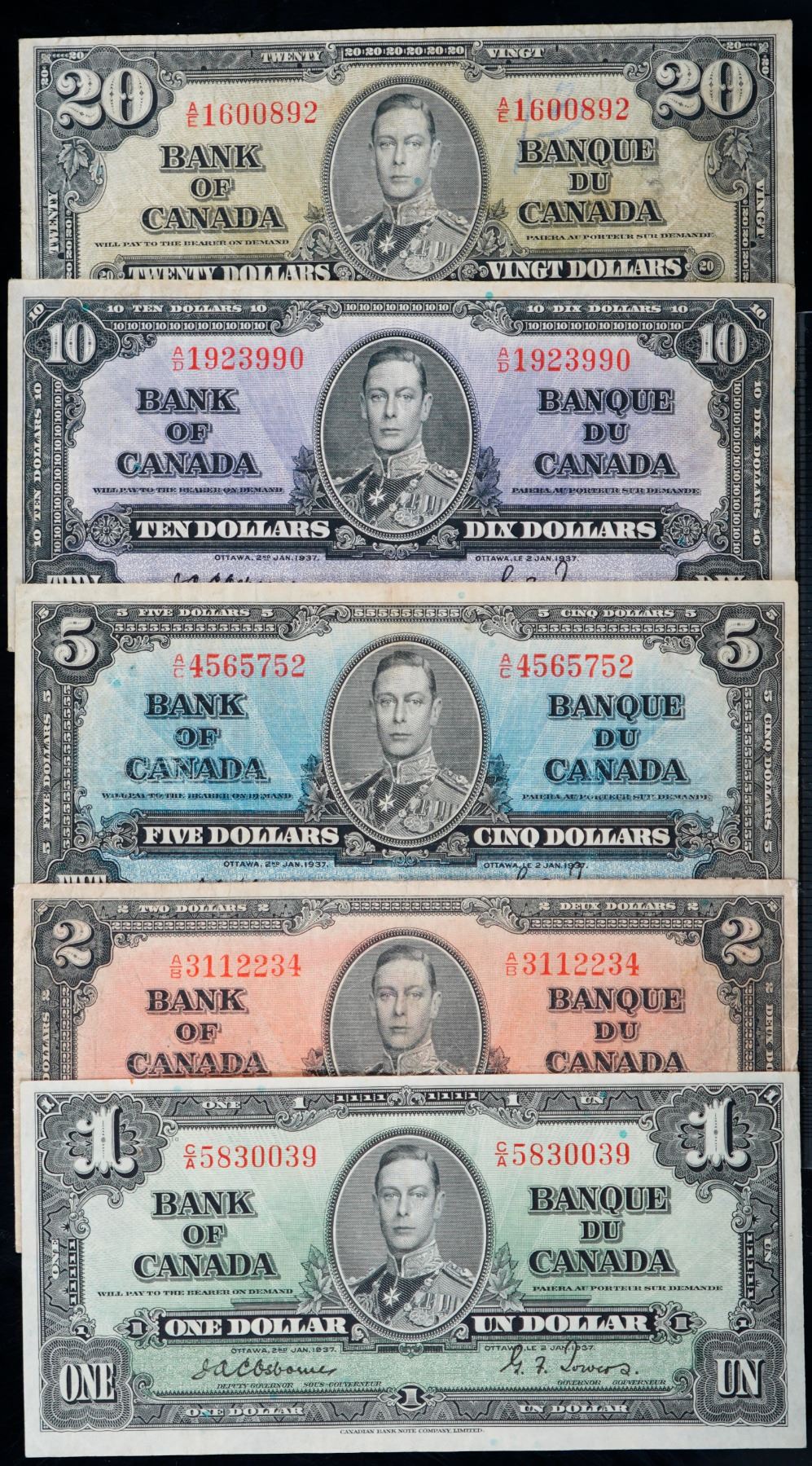 Partial Set; 1937 $1 BC-21a, $2 BC-22a, $5 BC-23a, $10 BC-24a, $20 BC-25a - 6 note set with all Osborne-Towers signatures. Average Grade VF. A nice and desirable group.