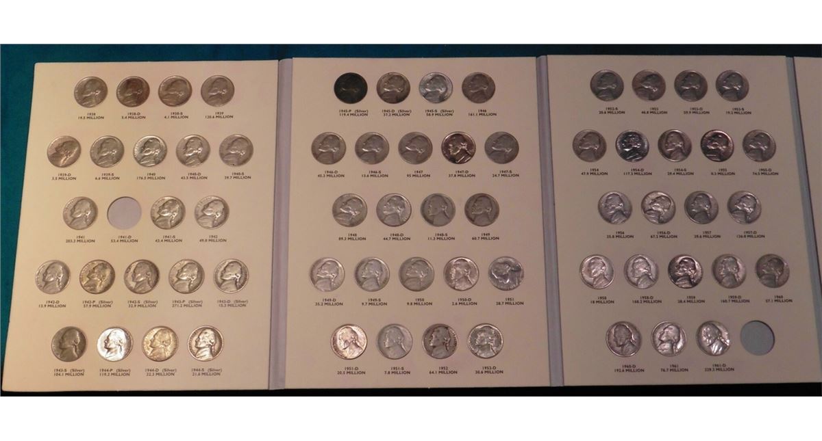 Partial Set of 1938-1961 D Jefferson Nickels in a green Littleton Custom Coin folder. Missing only the 1941 D. The 1944 P Silver War Nickel and 1950 D are both BU as well as a few others. (64 pcs.).