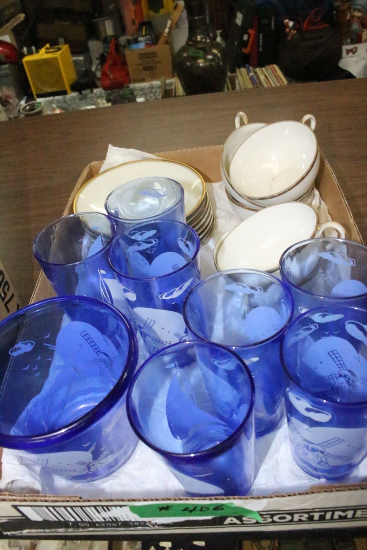 Partial Set of Gold Trimmed Dishes & a Set of Blue, Dutch Patterned Ice Bucket & 7 Glasses