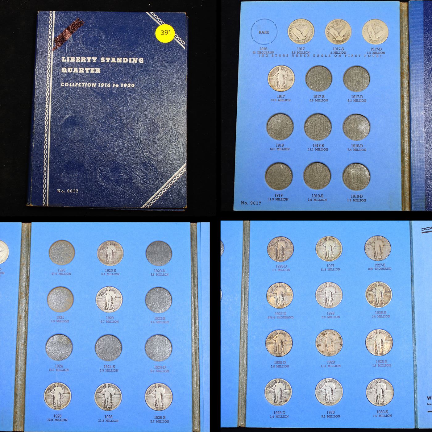 Partial Standing Liberty Quarter Book 1917-1930 21 coins. A excellent partial Standing Liberty Quarter book. Dates Included range from 1917-1930. All coins encased in a nice Whitman book. An Excellent grouping of 21 coins.
