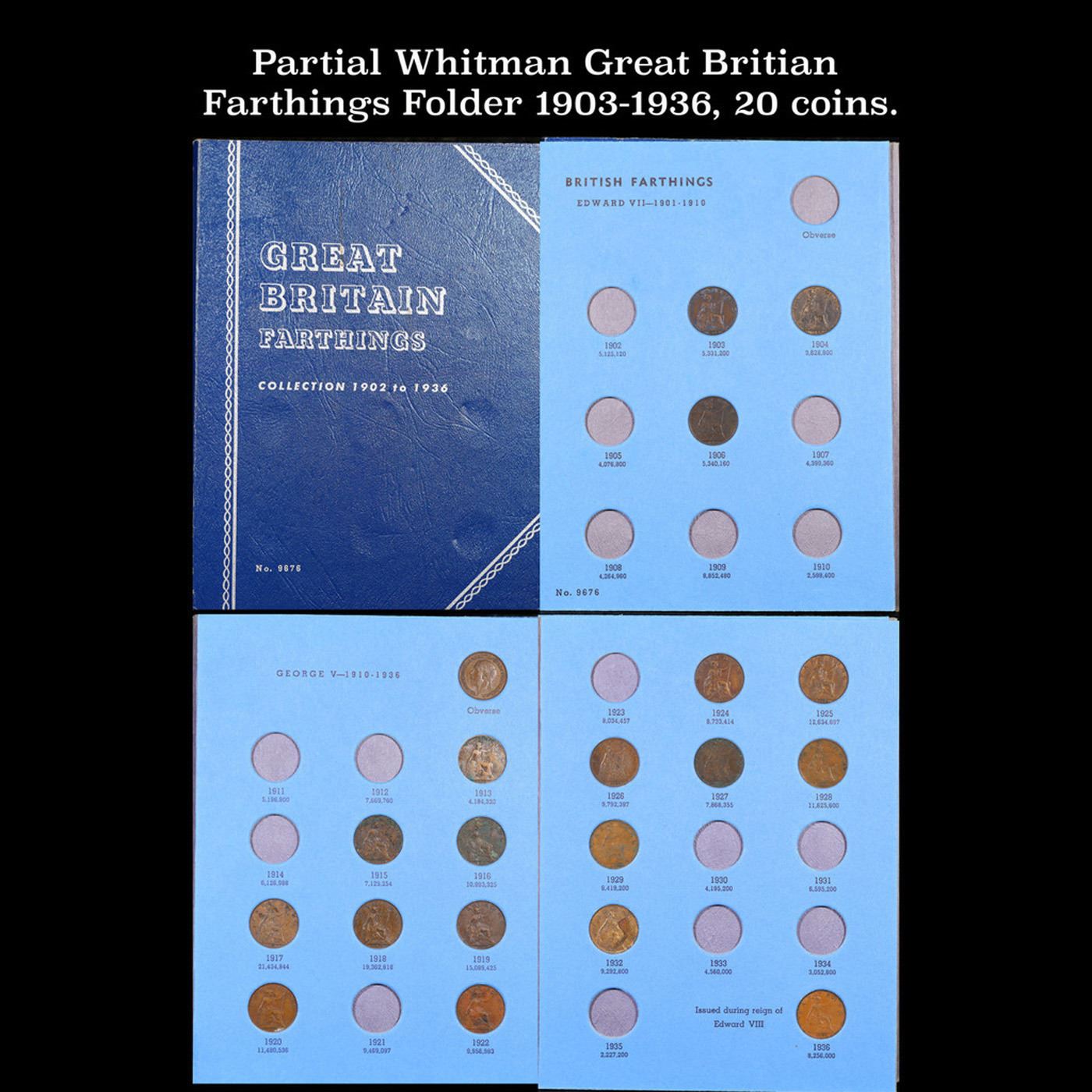 Partial Whitman Great Britian Farthings Folder 1903-1936, 20 coins.. All coins encased in a nice Whitman Great Britain Farthings Collection 1902-1936. The Dates are 1903-1936. A fantastic grouping of 20 coins, one of which are extra use to show off the obverse.