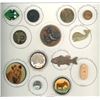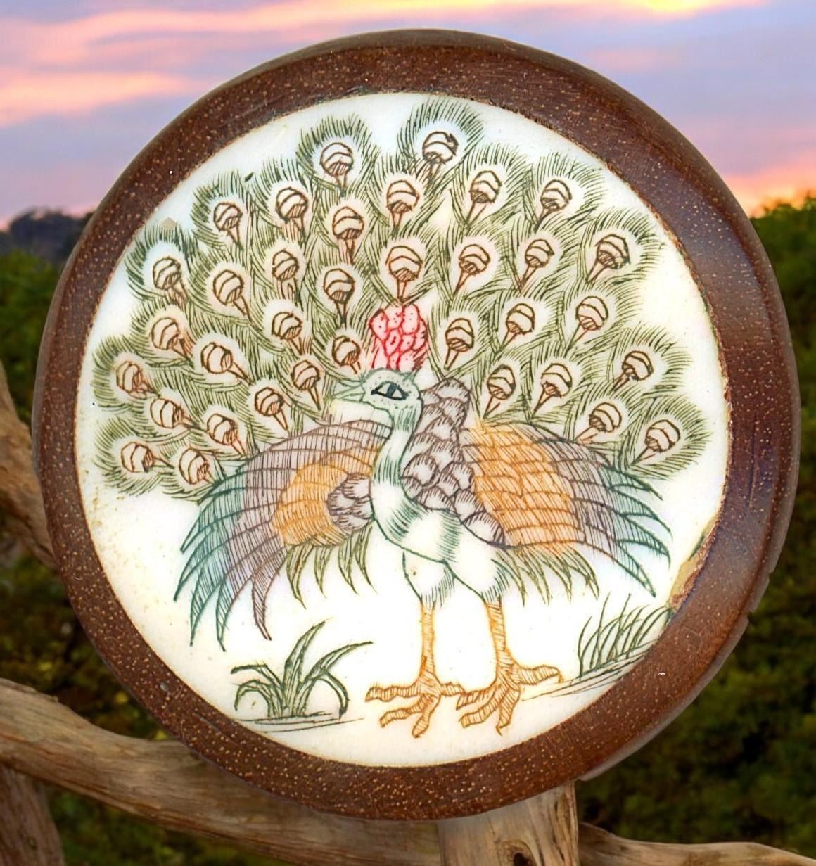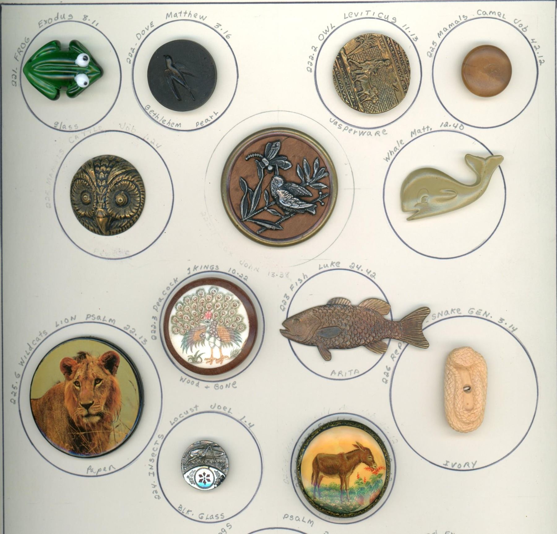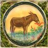 19 S/M/L 19th/20th century assorted material examples. This nice selection of animals includes a colorful Peacock engraved and pigmented on bone and set in wood, a lampwork glass realistic frog, a detailed and fine Russian Lacquer Donkey, ceramic fish, horn, wood background, VI and more.
