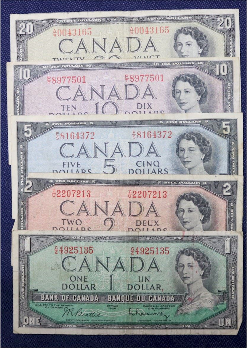 Partial denominational type set of the 1954 modified series of Banknotes. You will receive 5 notes from 1954; a $1, $2, $5, $10 and $20. The notes are in VG or better condition and may contain holes, tears and/or graffiti.