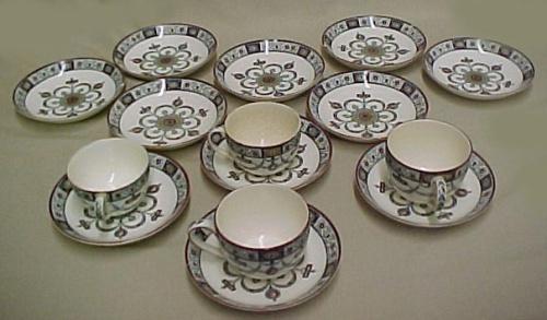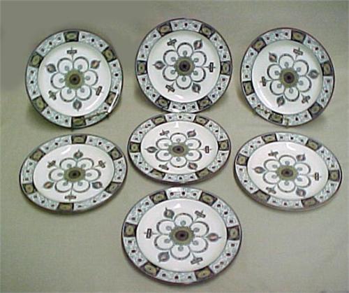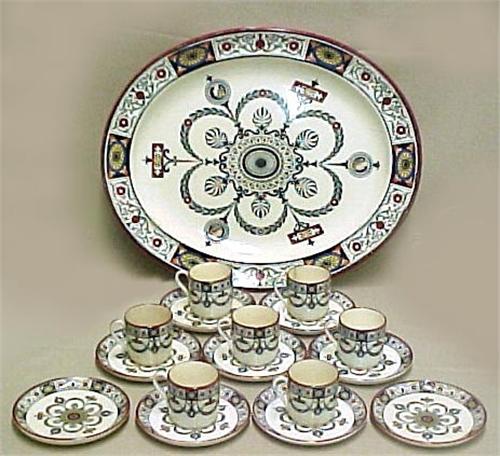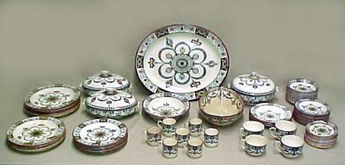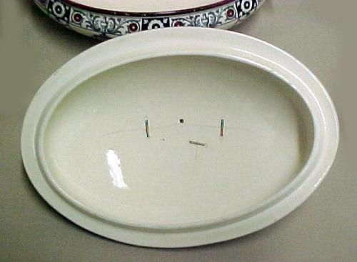 Partial set of Wedgwood "Adams" Etruria dinnerware including 16 3/4" oval platter (slight glaze loss on rim); two 10" oval covered vegetables (one with hairline crack inside bottom and one lid with early staple repair inside); one 8" round covered vegetab