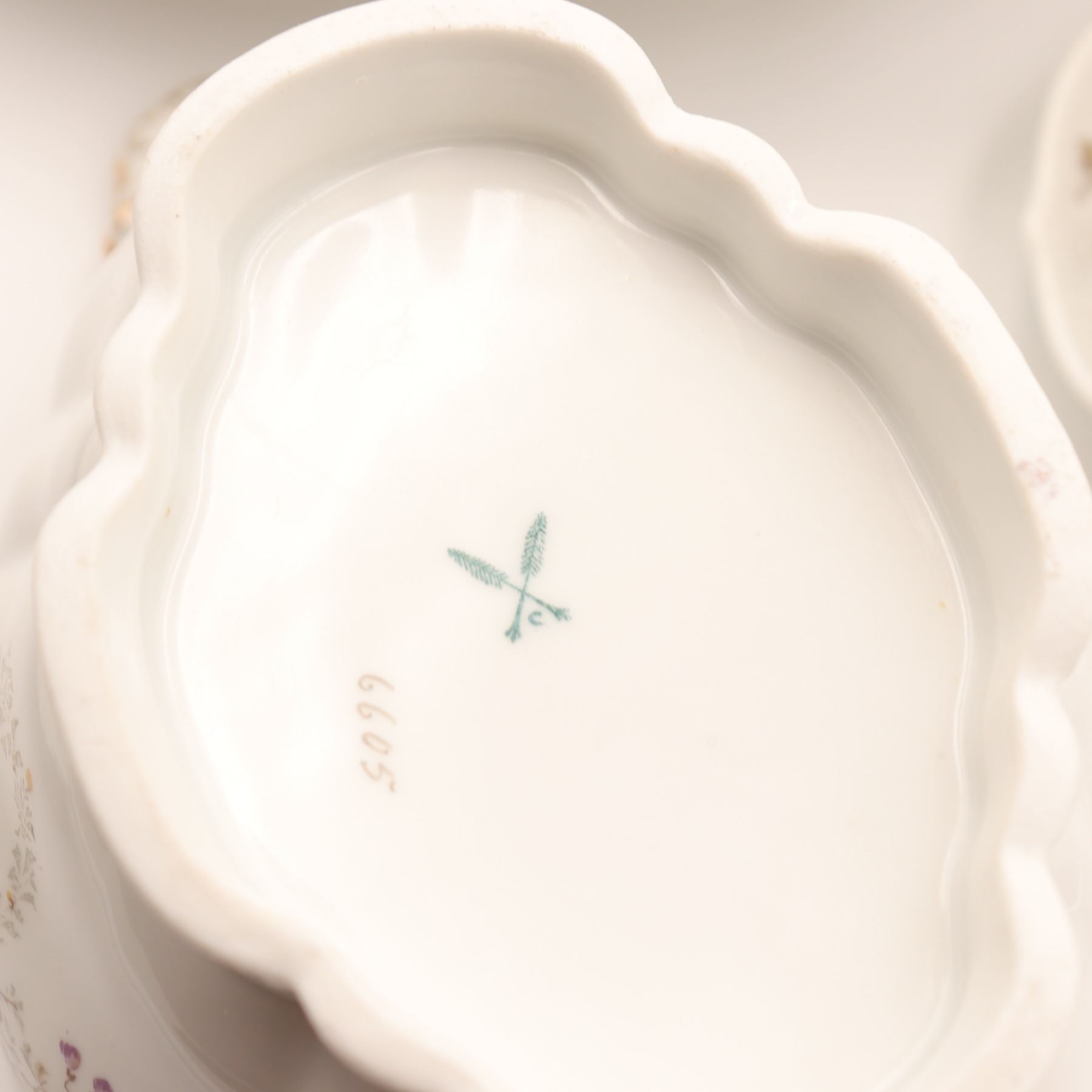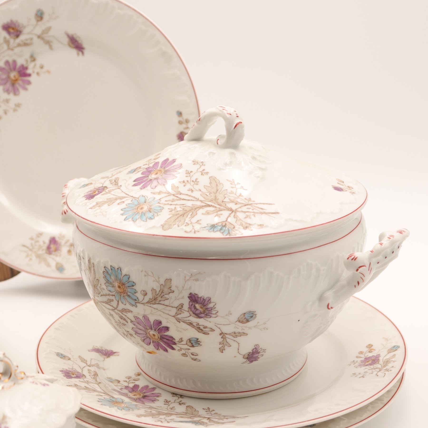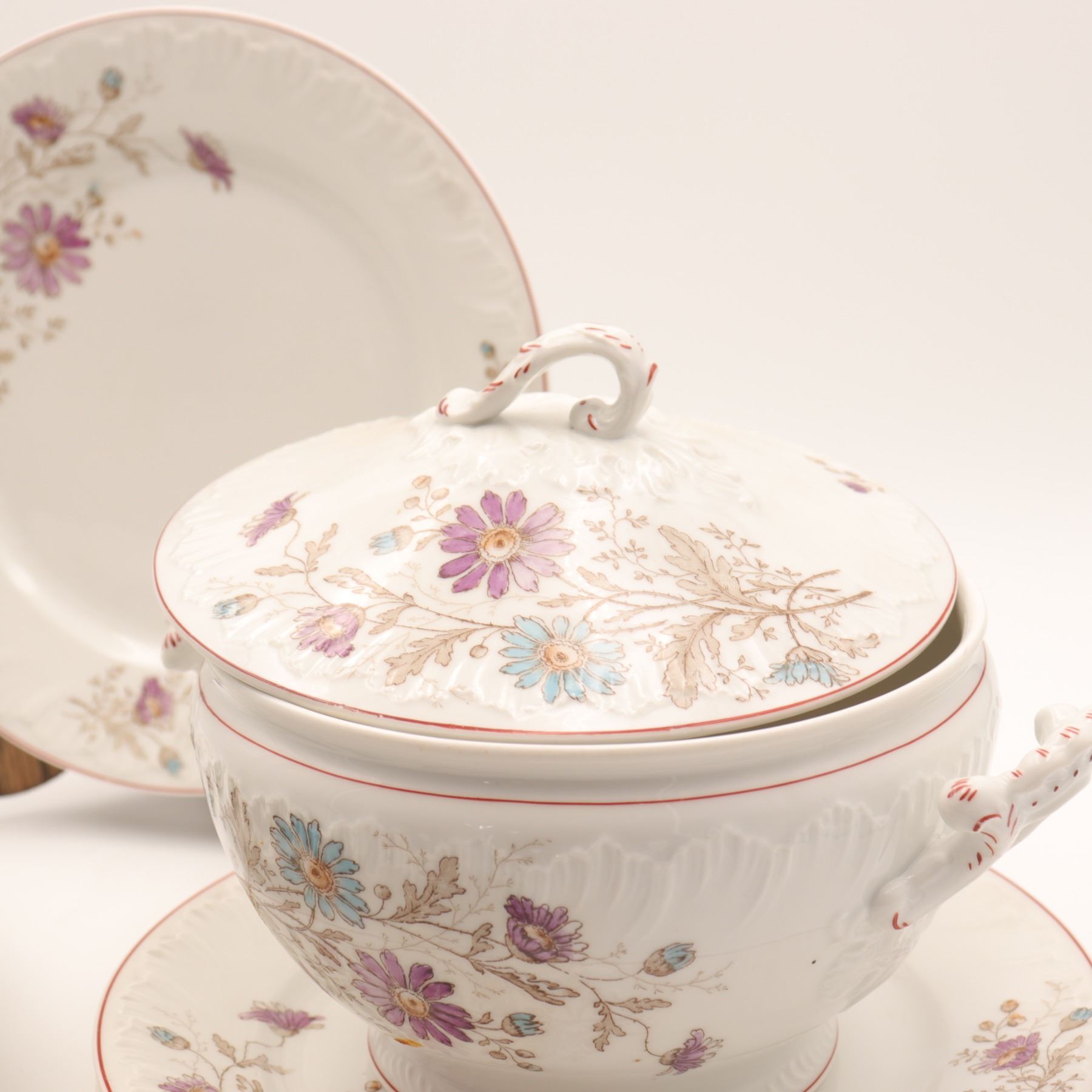 A late 19th-century Continental porcelain partial service, probably German, comprising a covered tureen with stand, dinner plate, handled cup with underplate, shaped serving platter, and a small covered condiment pot with stand. The pieces are decorated with delicate floral sprigs in mauve and pale blue with sepia-toned foliage on a white ground, with molded rococo-revival borders and red line rims. Only two pieces retain a green crossed-device mark with painted numerals, and the group is best catalogued as a partially marked Continental service rather than assigned to a specific factory. A decorative table grouping with strong tureen form and coherent floral decoration. Chip to one platter and minor damage to another serving piece; otherwise light general wear consistent with age and use.