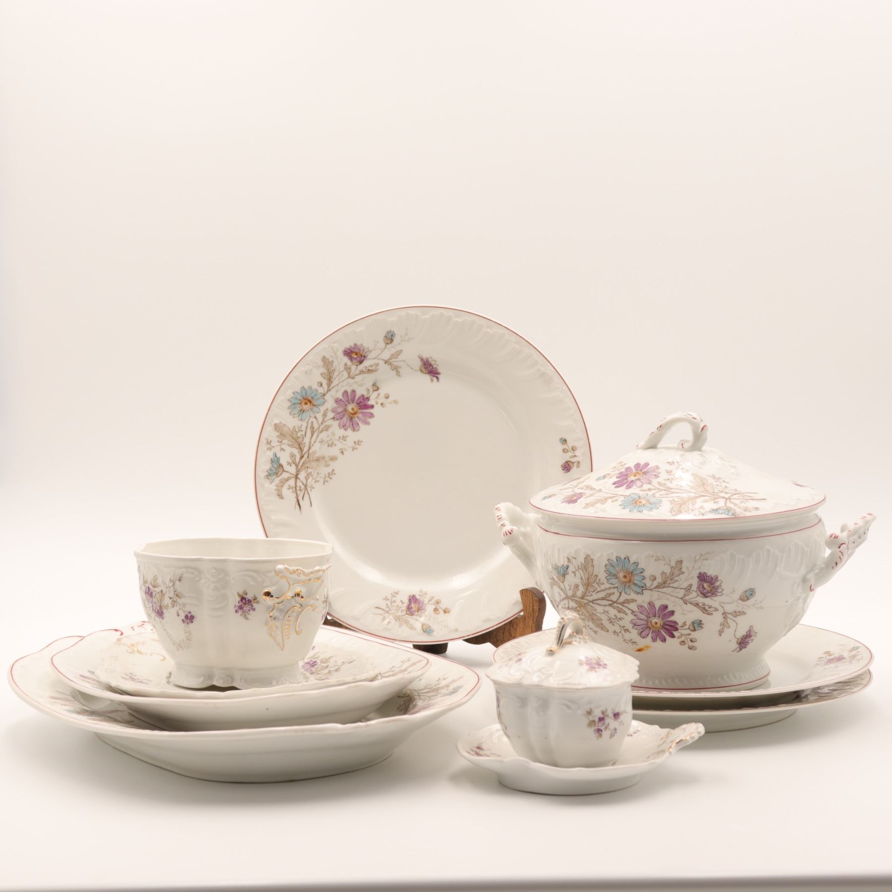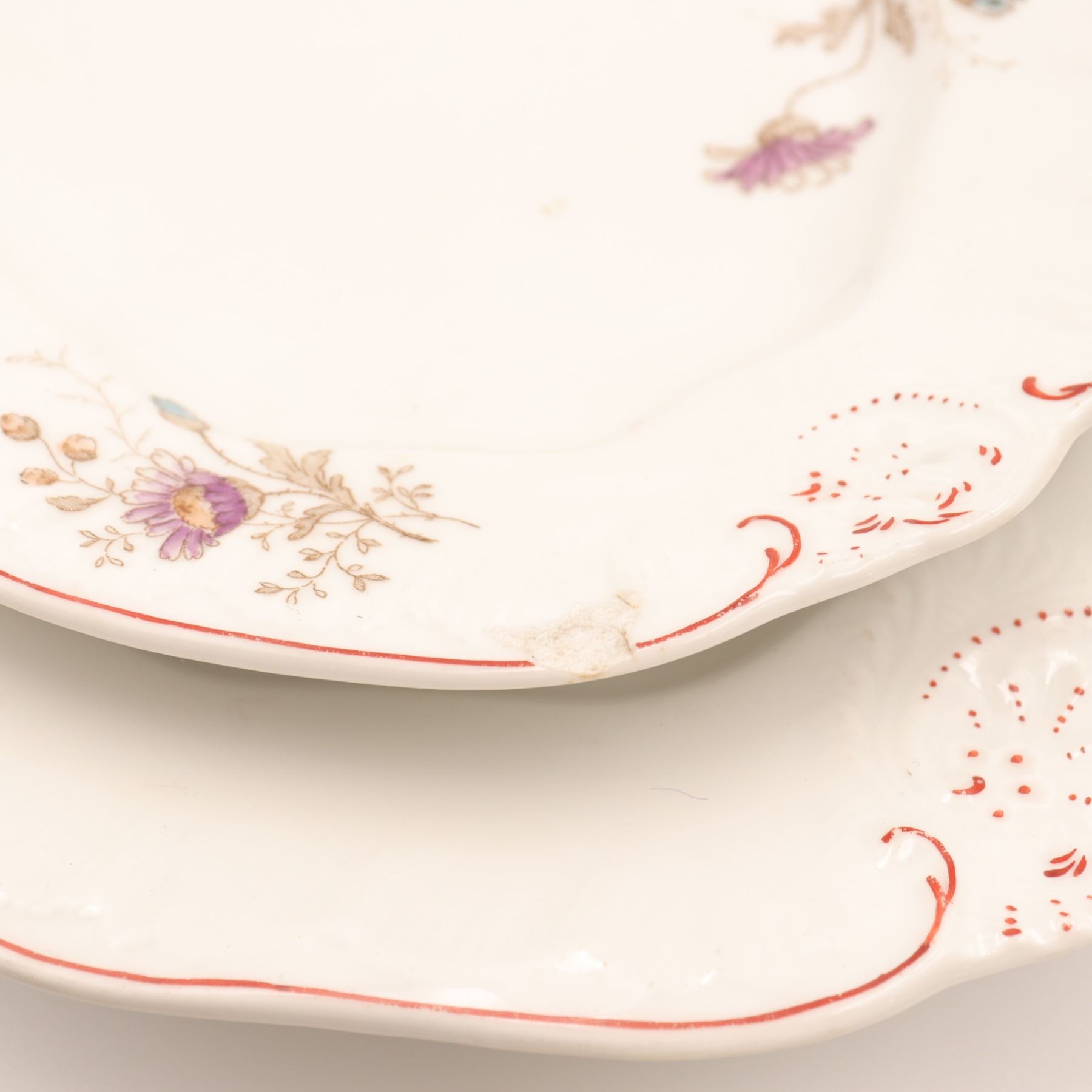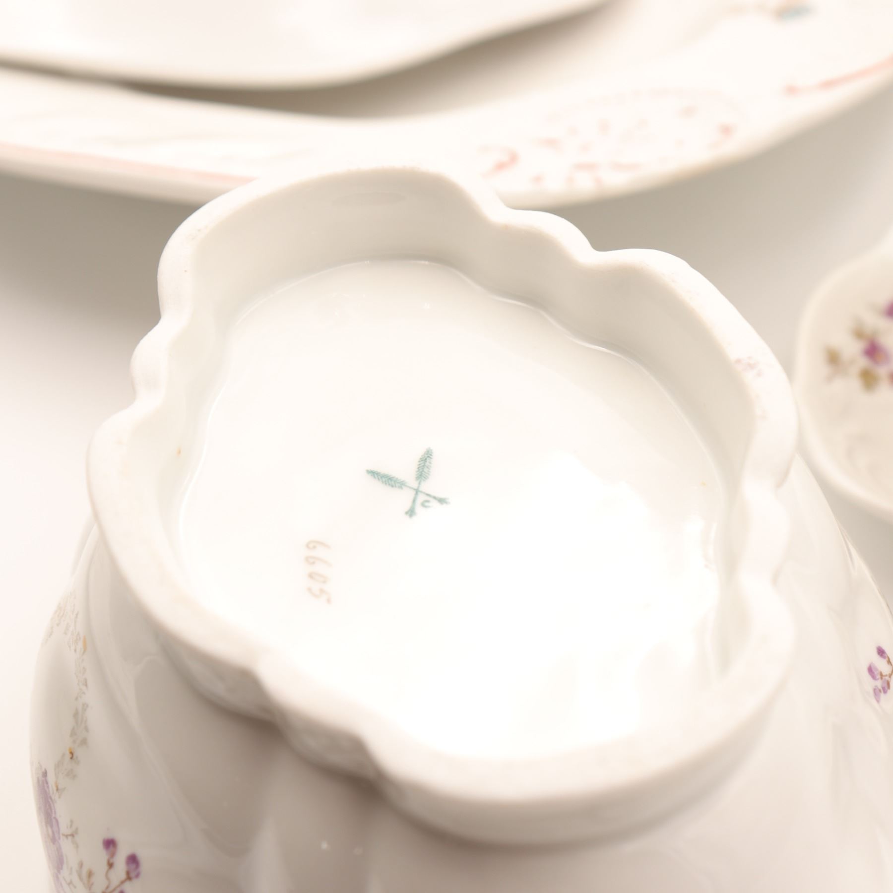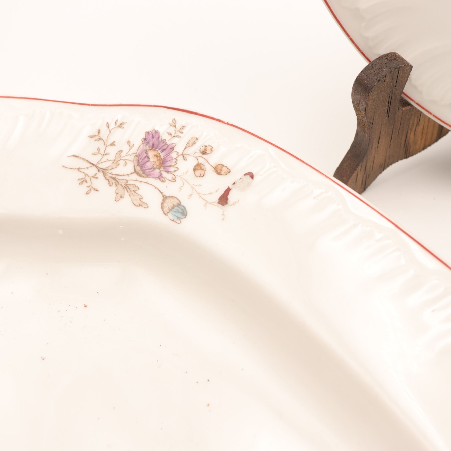 A late 19th-century Continental porcelain partial service, probably German, comprising a covered tureen with stand, dinner plate, handled cup with underplate, shaped serving platter, and a small covered condiment pot with stand. The pieces are decorated with delicate floral sprigs in mauve and pale blue with sepia-toned foliage on a white ground, with molded rococo-revival borders and red line rims. Only two pieces retain a green crossed-device mark with painted numerals, and the group is best catalogued as a partially marked Continental service rather than assigned to a specific factory. A decorative table grouping with strong tureen form and coherent floral decoration. Chip to one platter and minor damage to another serving piece; otherwise light general wear consistent with age and use.