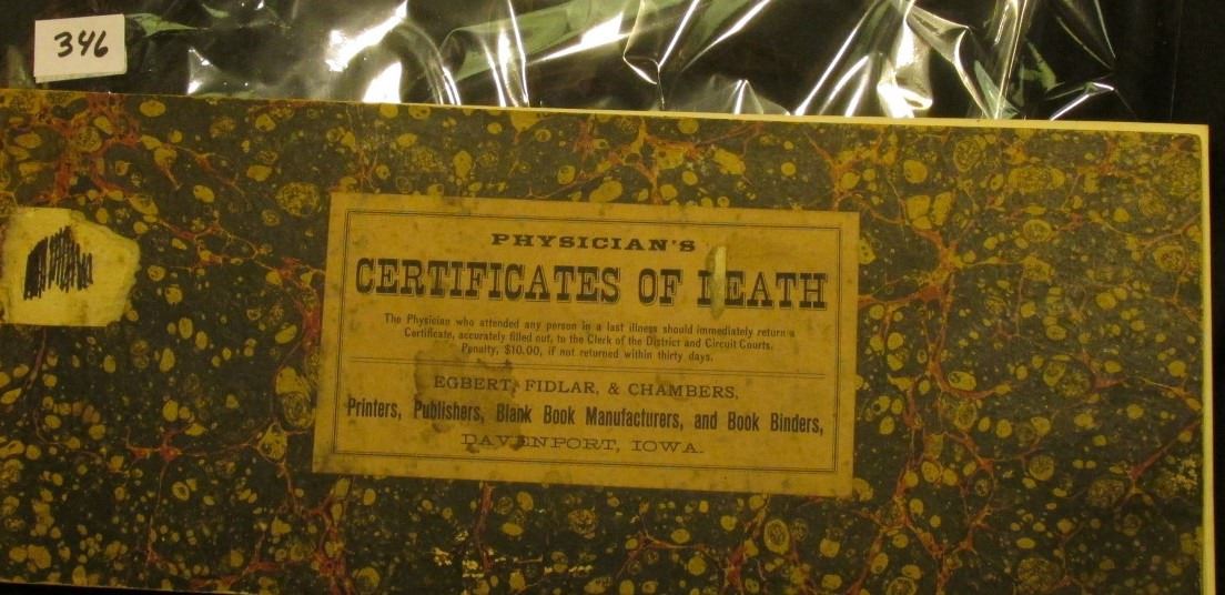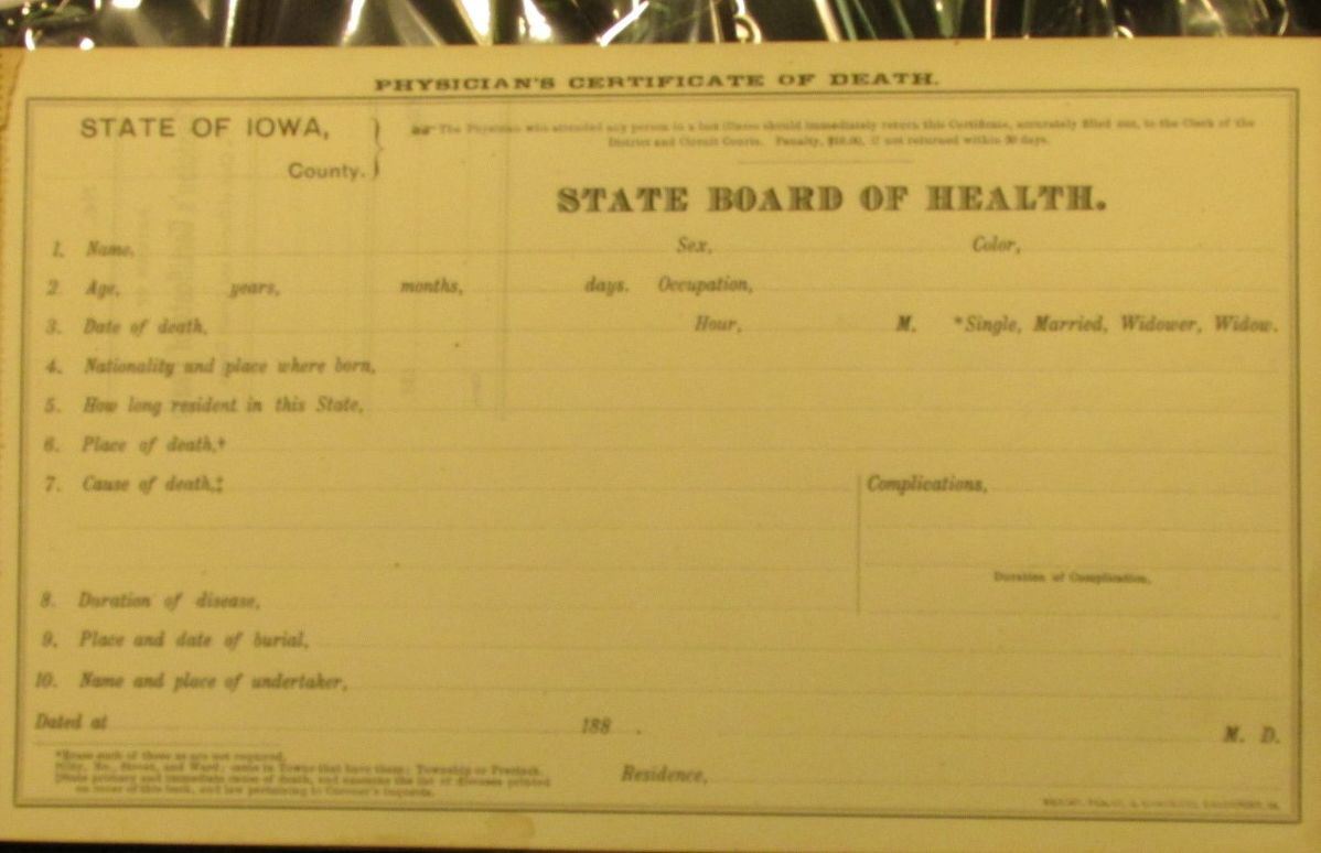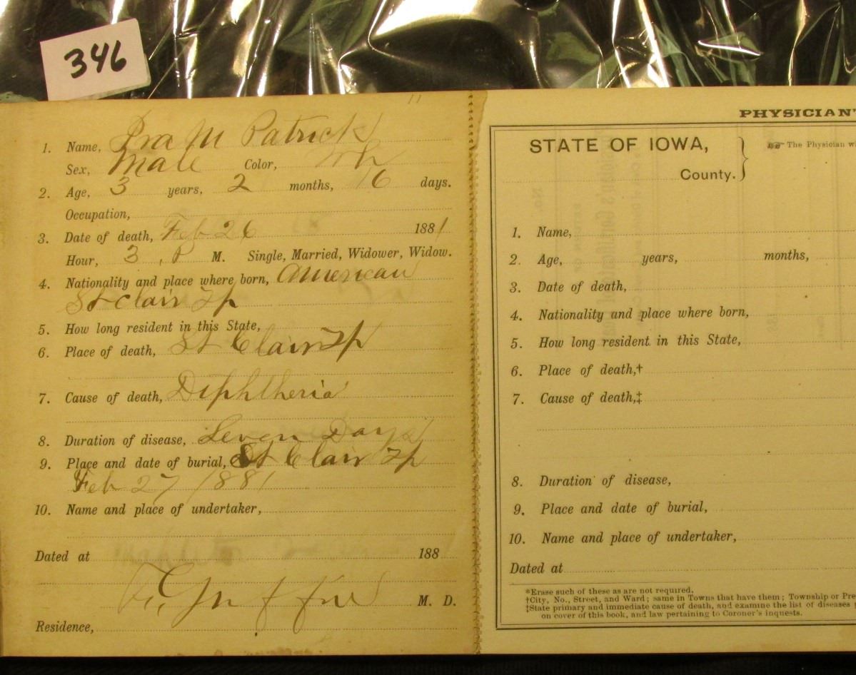 Partially used Book of Physician's Certificate of Death State of Iowa State Board of Health ca. 1880-82. Many of the people listed died of Diptheria or Cholera.
