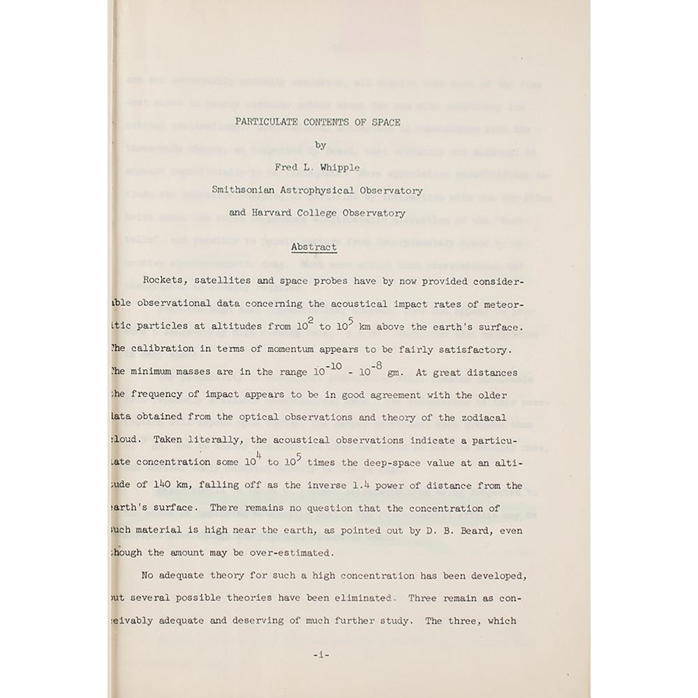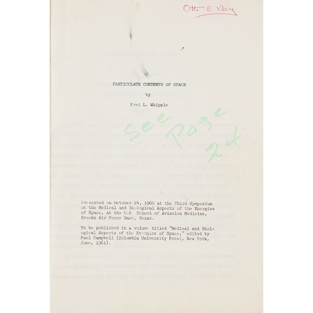 Otto Berg's copy of a lecture by renowned Harvard University astronomer Fred Lawrence Whipple, entitled "Particulate Contents of Space," 32 pages, 9 x 11.5, presented on October 24, 1960, at the Third Symposium on the Medical and Biological Aspects of the Energies of Space, at the U.S. School of Aviation Medicine, Brooks Air Force Base, Texas. The lecture includes an important discussion of the potential psychological effects of micrometeorites on astronauts: "The sounds of meteoroids impinging upon space vehicles will undoubtedly be heard by astronauts. The psychological effects should not be discounted; they will be comparable to the psychological effects of enemy gunfire on men who are under military siege. Astronauts will constantly be reminded of the fact that a hole may be punctured in the skin of the vehicle, with possible serious consequences…Space vehicles for human travel should certainly be designed to minimize the acoustical detectibility of meteoroids by the occupants. A 'meteor bumper' separated from the inner skin of the vehicle would reduce the noise of meteoric impacts in practically all cases in which the inner skin was not somewhat damaged." In fine condition, with a few annotations and highlighted passages.