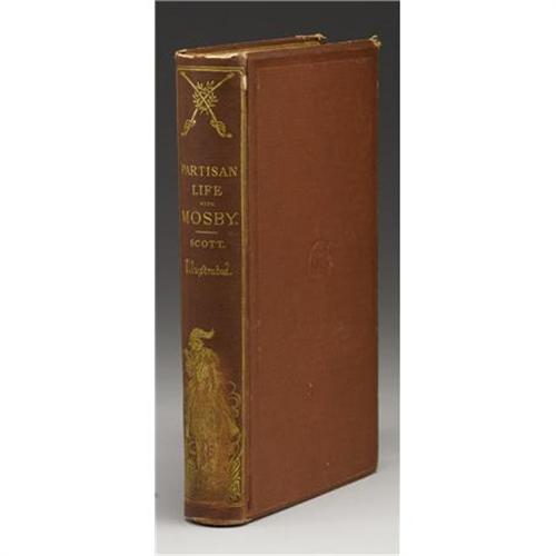 <B>Mosby Ranger Major John Scott: <I>Partisan Life With Mosby</B></I></B></I> signed by John G. Beckham, another Mosby Ranger. Scott rode with famed Confederate cavalryman Colonel John Singleton Mosby and after the war, put down his recollections of the war in book form. This copy of <I>Partisan Life</B></I> is a first edition printed in 1867 by Harper Brothers of New York. It is a fascinating account of battles of the war, details of hand-to-hand combat, personal memories of Colonel Mosby, and information only Major Scott could give the reader. <BR><BR>Measuring 6¼” x 9¼”, this rust-colored cloth bound volume is illustrated with portraits of Mosby and his men as well as battle scenes. The binding is intact and is beautifully gilt-stamped with crossed sabers at the top, lettering, and a depiction of Mosby charging on his horse, pistol drawn at the bottom of the spine. There is some foxing throughout, but otherwise this historic book is in good condition. <BR><BR><B>Provenance:</B></I> <I>The Tharpe Collection of American Military History</B></I> <BR><BR><B>Exhibited:</B></I> <I>The Liberty Heritage Society Museum</B></I><BR><BR><b>Shipping:</b> Books & Catalogs (<a target="_blank" href="http://www.heritageauctions.com/common/shipping.php">view shipping information</a>)