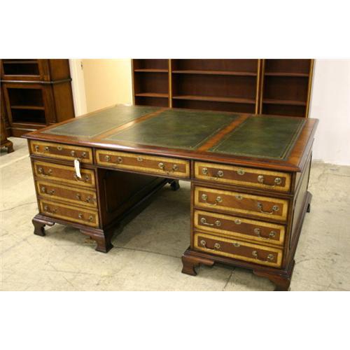 Fine quality mahogany Partners' Desk made in England. Satinwood trim, oxidised brass swan-neck handles. Sectionalised hand tooled and gilded dark green leather surface. 'Antique' patina. Fully functional both sides including file drawers (4) cupboards for computer towers (2) and ample storeage drawers. One side has center drawer for keyboard. All sides panelled. Twin pedestals with removeable top for easy transportation.