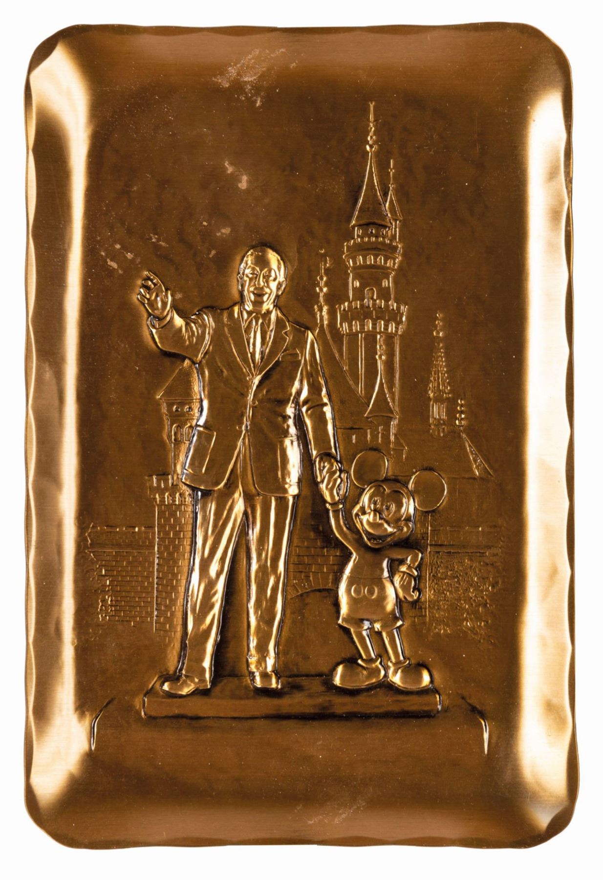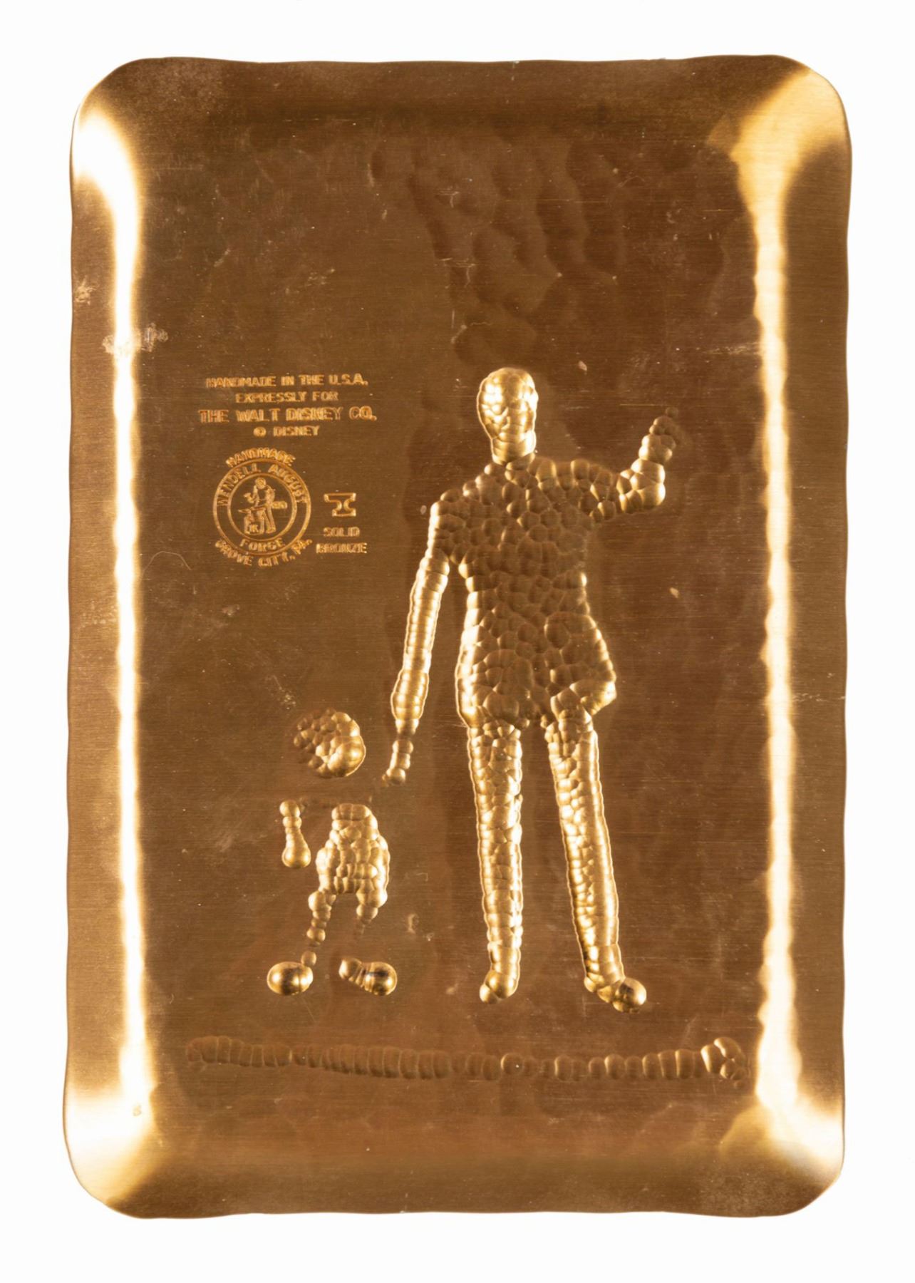 (Disneyland, c.1990s) A hand-hammered solid bronze tray featuring a relief image of the iconic composition by Blaine Gibson, "Partners." Created by the Wendell August Forge expressly for the Walt Disney Company, the tray measures 9"x6" and is in fine condition. The reverse is stamped with materials and maker's hallmarks, and the piece exhibits minimal wear.