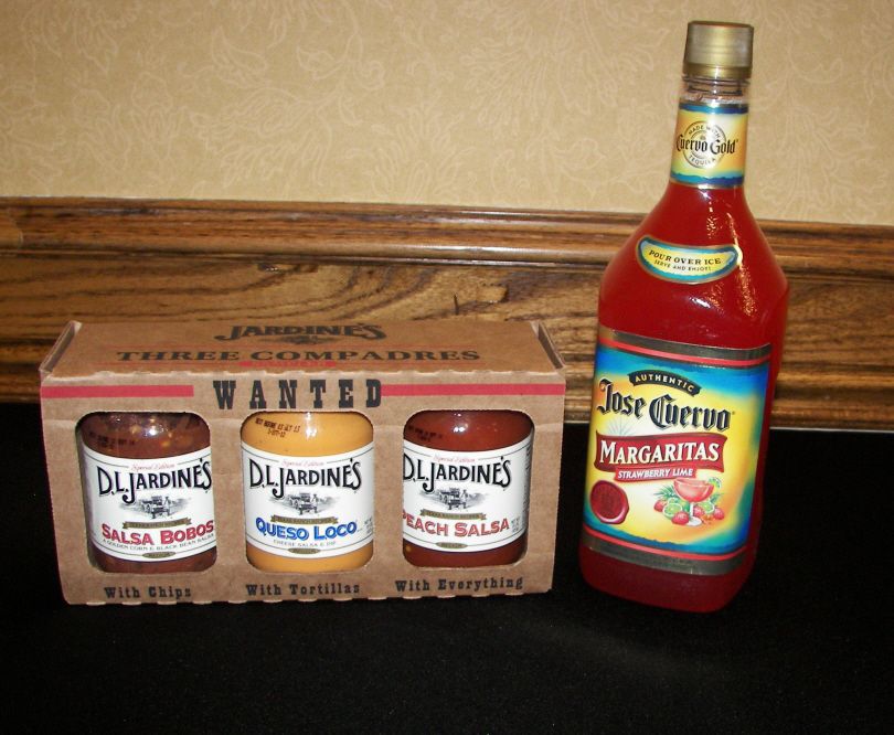 Party in a package,D.L. Jardine's Salsa Queso, And a bottle of Strawberry mararitas