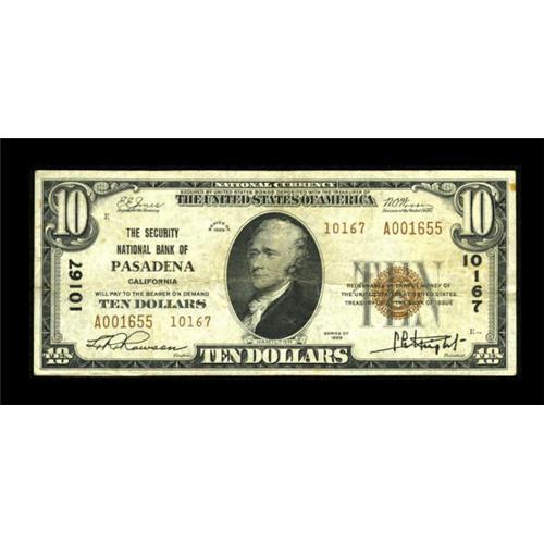 <B>Pasadena, CA</B></I> - $10 1929 Ty. 2 <B>The Security NB</B></I> Ch. # 10167<BR> Some staining is noticed on this <B>Fine-Very Fine</B></I> example. Officers are C.L. Wright and L.R. Rawson.<B></B></I><BR><I>From The Kansas City Collection.</B></I><BR><BR><b>Shipping:</b> Coins & Currency (<a target="_blank" href="http://www.heritageauctions.com/common/shipping.php">view shipping information</a>)