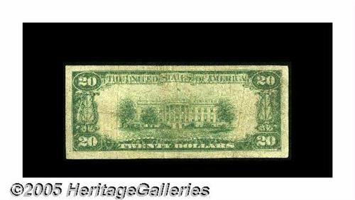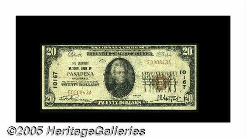 <B>Pasadena, CA</B></I> - $20 1929 Ty. 1 <B>The Security NB</B></I> Ch. # 10167<BR>A <B>Fine</B></I> example from a strongly collected locale. Although this institution was the most prolific issuer of the eight federally chartered banks located here, there never seem to be enough notes available to meet the always growing demand for California material.