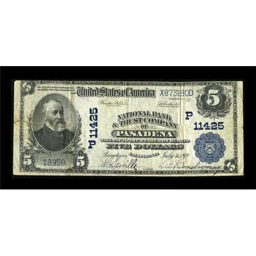 <B>Pasadena, CA</B></I> - $5 1902 Plain Back Fr. 606<B> NB & TC</B></I> <B> of Pasadena </B></I>Ch. # (P)11425<BR> Fives only from this scarce bank, which was in business for only two years before bowing out in 1921. Track & Price shows only three offerings from here since 1987, and two of those involved the same note. <B>Fine++,</B></I> with a tiny margin split that affects nothing.<BR><BR><b>Shipping:</b> Coins & Currency (<a target="_blank" href="http://www.heritageauctions.com/common/shipping.php">view shipping information</a>)