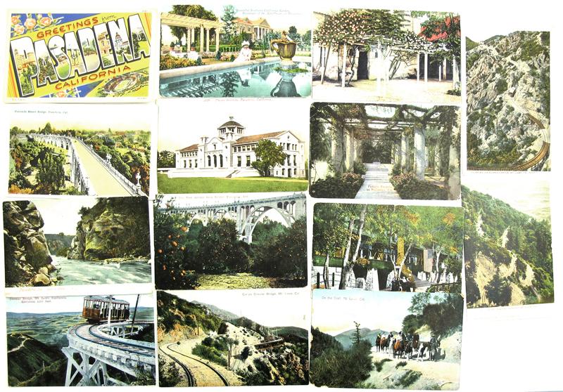 Lot of 28 including some RPCs. The collection includes Pasadena pictures of the Colorado Street Bridge, Devil’s Gate, buildings and residences in the city, the Oldest Rose Tree in California at the San Gabriel Mission and others. The Mt. Lowe pictures include the Pacific Electric Railway tracks on Mt. Lowe, a snow covered lodge, the circular bridge, Mt. Lowe trolley, and the Alpine Tavern, among others.