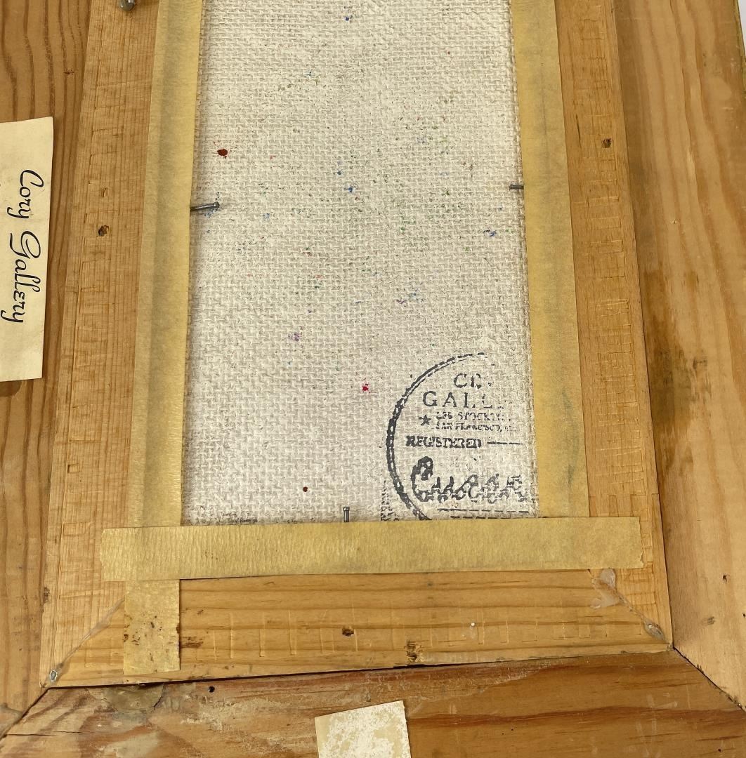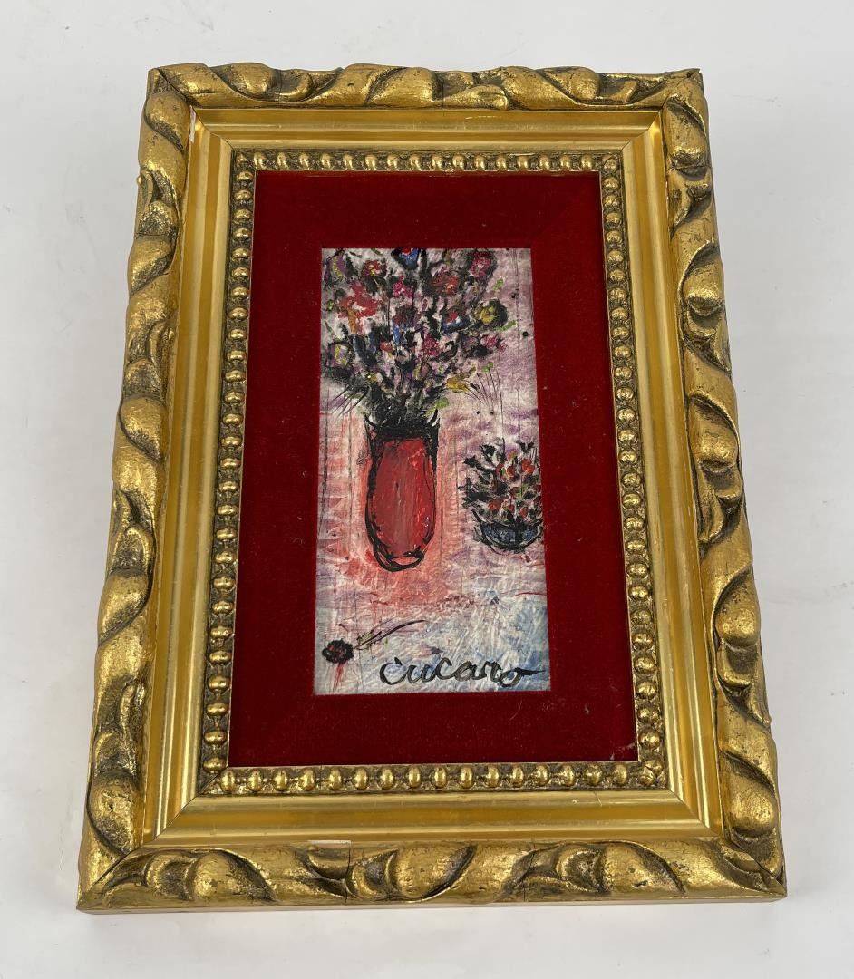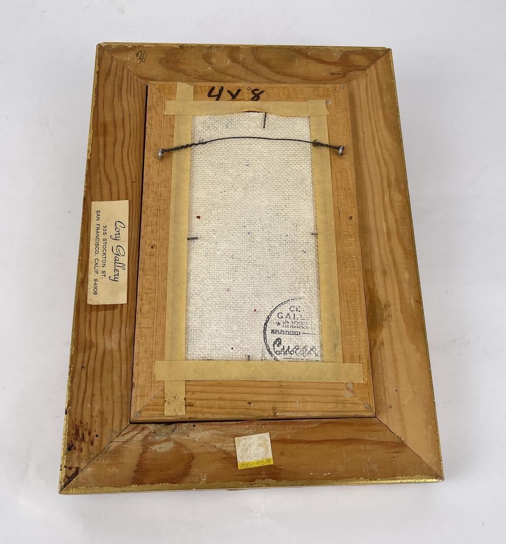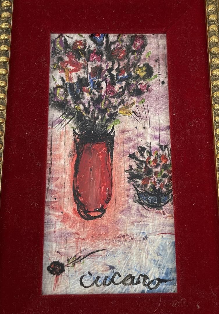9" by 13" framed. Signed as shown. Pascal Cucaro (1915 - 2004) was active/lived in California, Ohio. Pascal Cucaro is known for Clowns, marine, animal and portrait painting. Pascal (Pat) Cucaro was born in Youngstown, Ohio on November 6, 1915, to Italian immigrant parents. He worked in the circus during his childhood summers -- the experiences giving him a lifelong interest in clowns, and circus life. His painting style is characterized by a bold gestural quality, complimented by a thick application of paint. In some cases, the artwork has paint so thick it seems to have been applied straight from the tube. After serving in World War II, he attended the California School of Fine Arts in San Francisco, then returned to Europe to spend time in France, Spain, and Italy to study art on his own. He became part of the art scene during the lively 'Beat' years in San Francisco's North Beach section, and exhibited his work at the Black Cat Cafe, The Iron Pot, The Lion Book Shop, The City Lights Book Shop, Vesuvio's, and The Hungry I. A one-man art show held at the Butler Institute of American Art at his hometown in 1958 was followed by other exhibitions in California, as well as Hawaii and Japan. He was nominated for the Presidential Medal of Freedom in 1965. He has traveled extensively abroad to find new inspirations for his work -- to Japan, Thailand, Burma, Sri Lanka, China, Greece, Turkey, Israel, Tahiti, and throughout Europe. He has explored a variety of subjects: clowns, circus scenes, boats, street scenes, still lifes, coffee shops, crowd themes (what Cucaro calls "people-people" paintings) animals, abstracts, portraits, and mediums such as oils, acrylics, plastic, ceramics, watercolors, tempera, etchings, india ink, ink/wash, and prints. To see him with his sunned complexion, his beret cocked over one ear, his chin and his nose, one would easily take him for a child of the Basque country or Burn. His Latin origin explains this resemblance, and it was likewise this Latin blood that drove him to travel in France and Spain. From his Parisian sojourn, from his studies in private studios, his long strolls along the length of the Seine or across the French countryside, he has brought back pictures which some feel vibrate with some of the magic of his masters; Cezanne, Lautrec, Utrillo and Dufy. The walls of his studio smile at you when the sun envelops them with its dust-laden light. They are hung with scenes evocative of the picturesque Paris discovered by the painter -- hidden spots, fountains forgotten by the tourist agencies, places where artists, painters and musicians dream again. This is the world of Pat Cucaro. Some of the scenes are of night-spots painted with humor and nostalgia a little in the manner of Lautrec, while others are abstract creations that are smoothly executed. Cucaro talks about only two things, painting and love. Those, he says, are his only interests. "I paint all the time, day and night. I have no television, no radio and only sometimes read the headlines of the newspapers." With dark, piercing eyes, a mobile face and expressive hands always on the move, the artist has been painting for over 70 years. From the beginning his work sold. "I was lucky," he says. "I didn't have to push hard to sell, and because of this I was able to work in peace. San Francisco has been good to me. I owe it to a woman who had faith in me from the beginning and believed in my talent. She bought my paintings as fast as I could make them and helped to get my name known." A continuous showing of Cucaro's work is maintained by Banducci's Hungry I -- a celebrated nightspot in the North Beach section of San Francisco. He is presently living in Marin County, across the Golden Gate bridge from San Francisco, and is still actively involved in his artwork. The City of Sausalito helped him celebrate his 85th birthday on November 6, 2000. A comment about Cucaro: "The great PASCAL (Pat) CUCARO gave me a book ("Cucaro," Sentinal Books, 1969) when I was a boy in the early 70's. My father used to own an art gallery in Sausalito when it really was a sleepy seaside artists community and during the summer I used to run around downtown all day. Cucaro used to hang out in the cafes, often talking to mesmerized young artists about art and life. He drew two pictures for me with a sharpie pen smearing the ink with his fingers for a paint-like effect. I remember that he always had ink or paint on his hands. And he smelled like garlic! :) He was a great guy, and that was a fun time of my life."