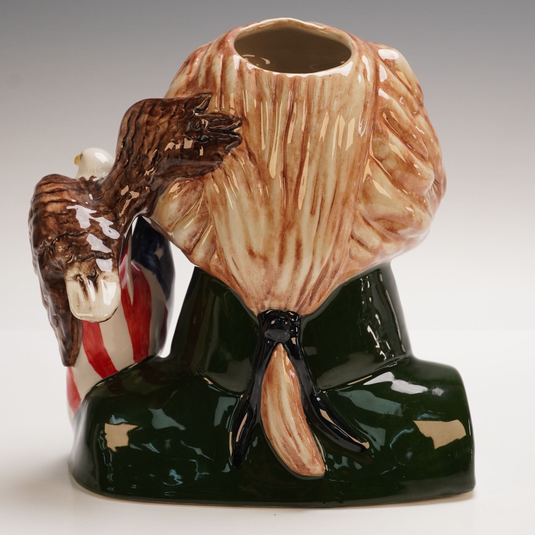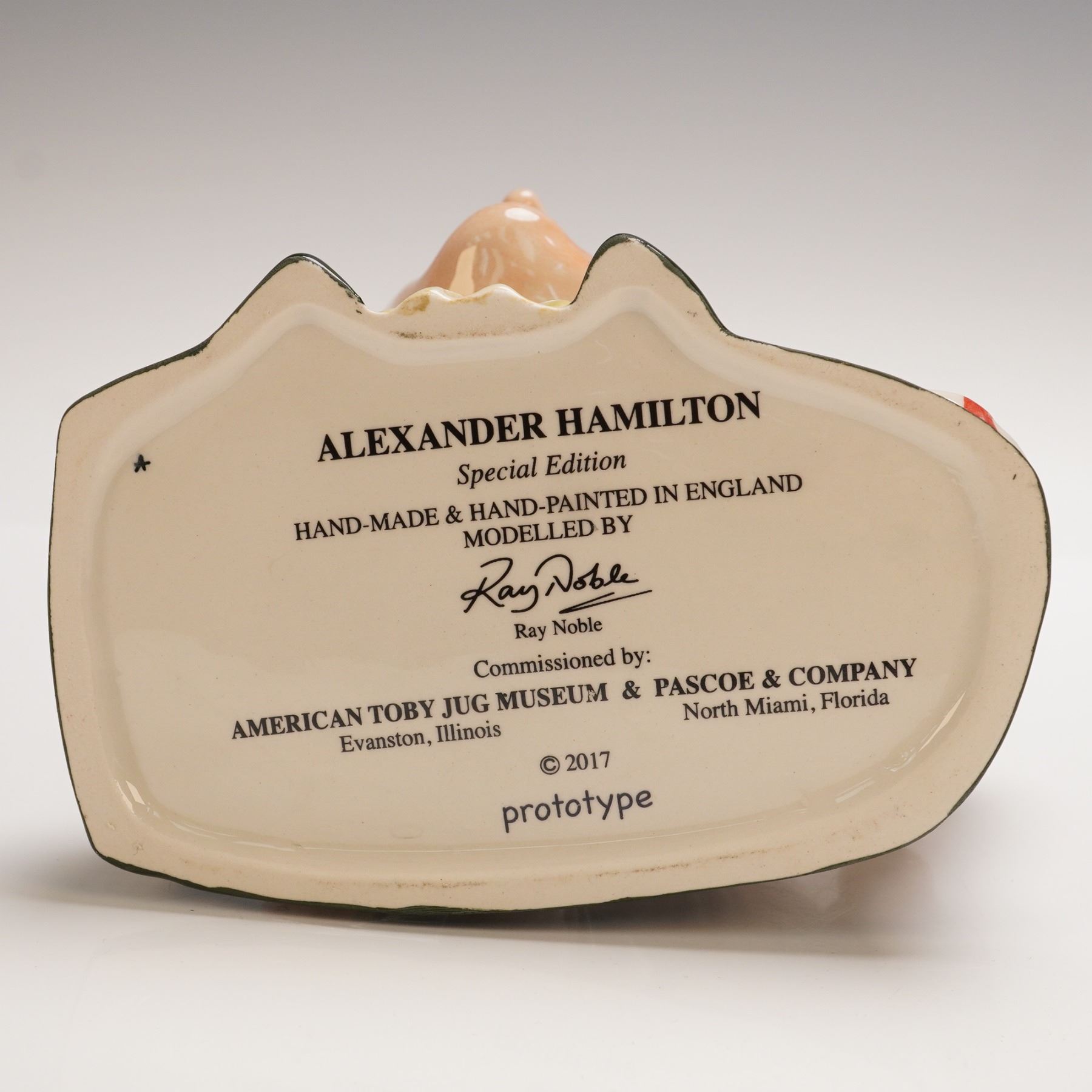 Hand-made and hand-painted in England, this special edition Alexander Hamilton Toby Jug was modeled by Ray Noble and commissioned by the American Toby Jug Museum and Pascoe & Company. Featuring a handle with a bald eagle and American flag, it is marked as a 2017 prototype.