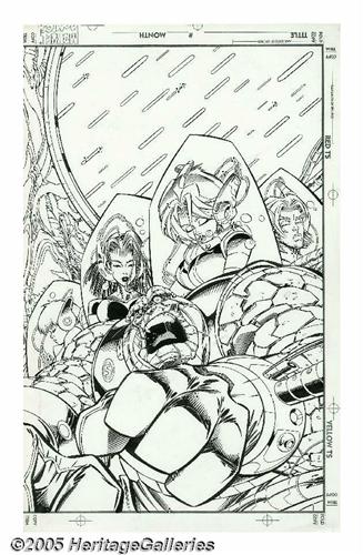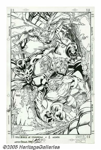 <B>Pascual Ferry and Art Thibert - 2099 World of Tomorrow #2 Cover Original Art (Marvel, 1996).</B></I> <B>2099 World of Tomorrow</B></I> is a follow-up title to Marvel‘s entire 2099 line. The eight part story bulged at the seams with all the characters it had to accommodate from the various individual titles such as <B>Spider-Man 2099</B></I>. This double-page wraparound cover illustration was penciled by Pascual Ferry and inked by Art Thibert. The image area measures 19.5" x 15" and the art is in Excellent condition.