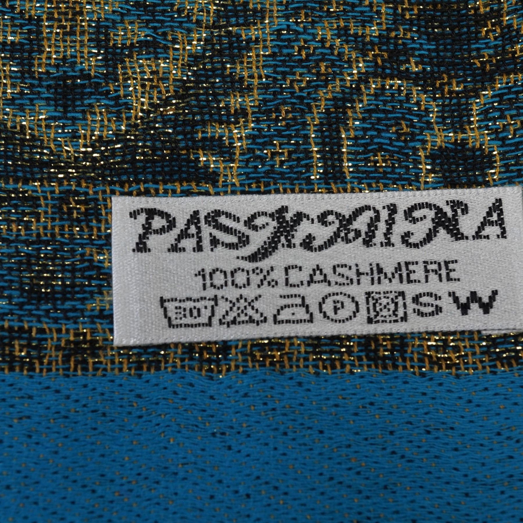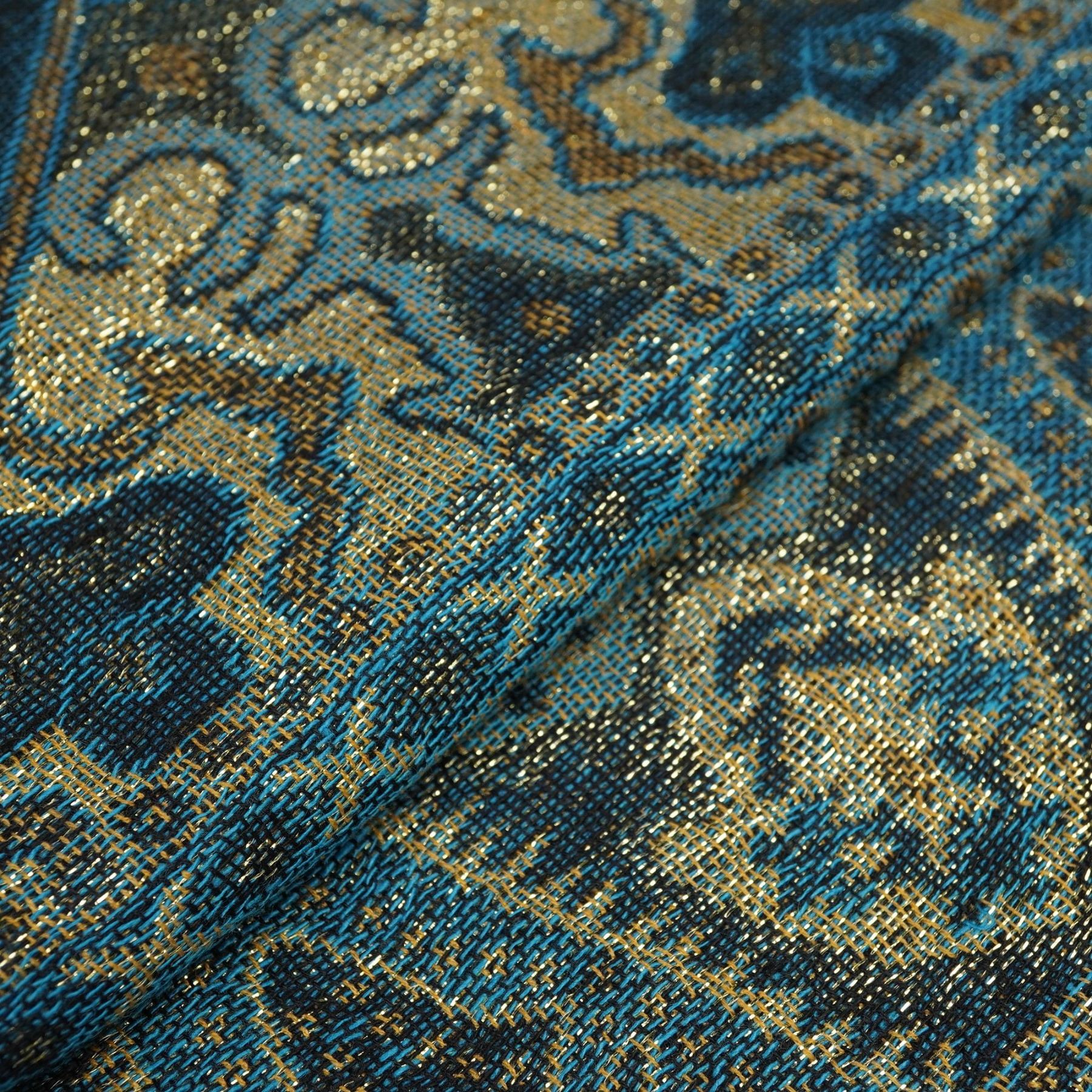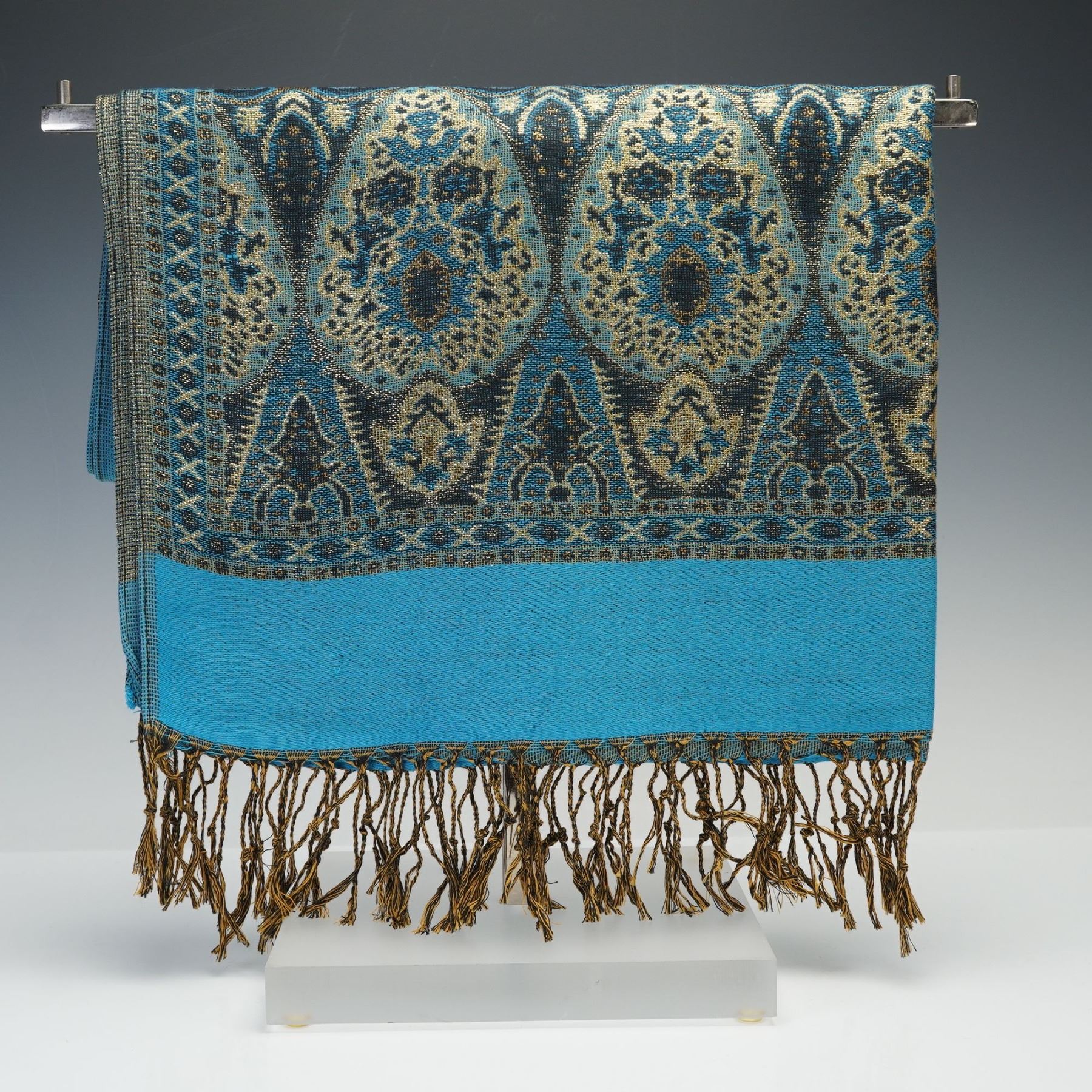 An exquisite Pashmina shawl crafted from 100% cashmere, featuring an intricate woven paisley motif in rich shades of turquoise, gold, and black. Metallic gold thread detailing adds a luxurious shimmer throughout, elevating the traditional pattern with a touch of opulence. Finished with twisted fringe ends, this elegant wrap drapes beautifully and offers both warmth and sophistication.