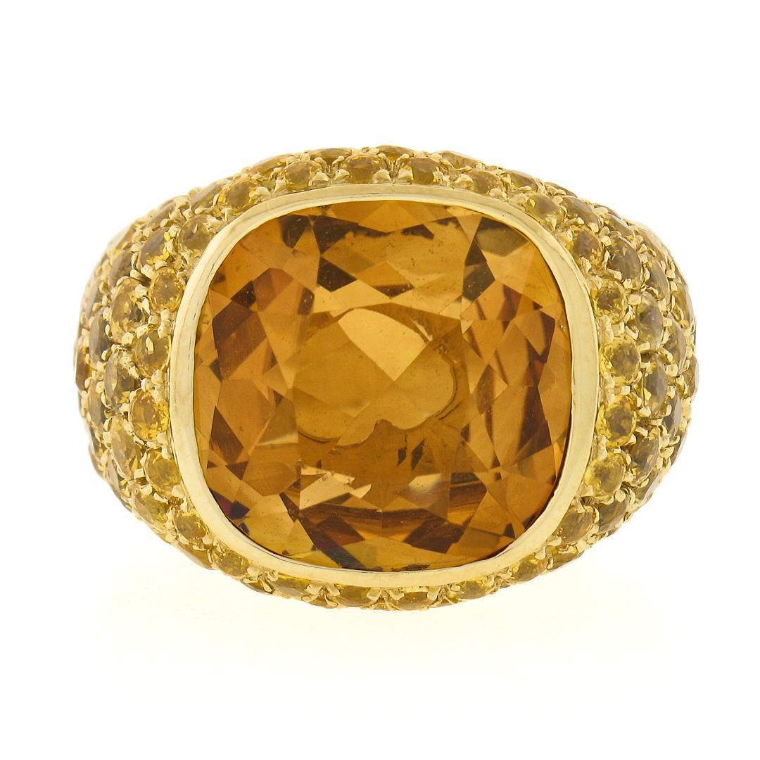 A solid 18k yellow gold cocktail ring by Pasqual Bruni, with 1 Large cushion cut natural citrine (10ct), and numerous of round cut natural yellow sapphires (5-6ctw). The ring is size 6.0, weighs a total of 24.33 grams, and measures 18.4mm wide.