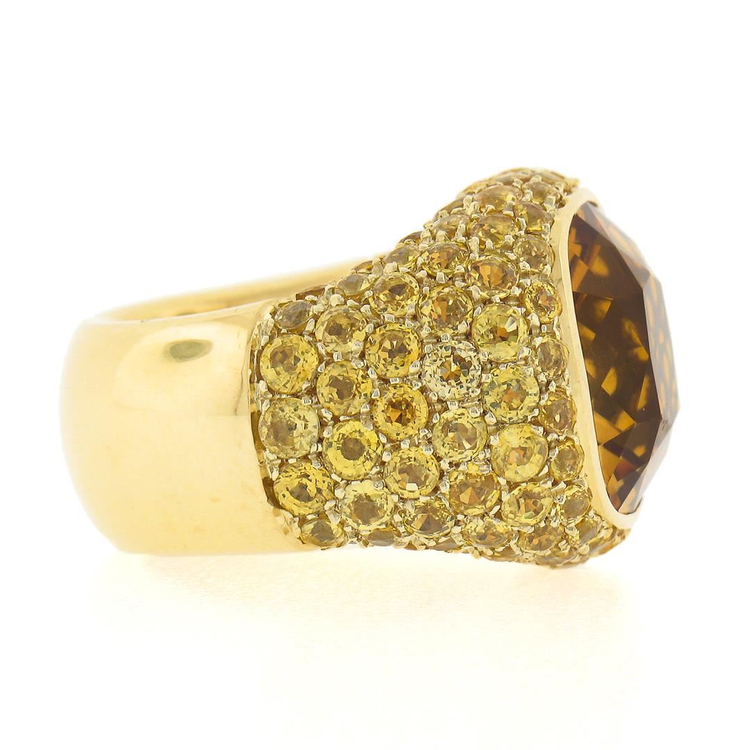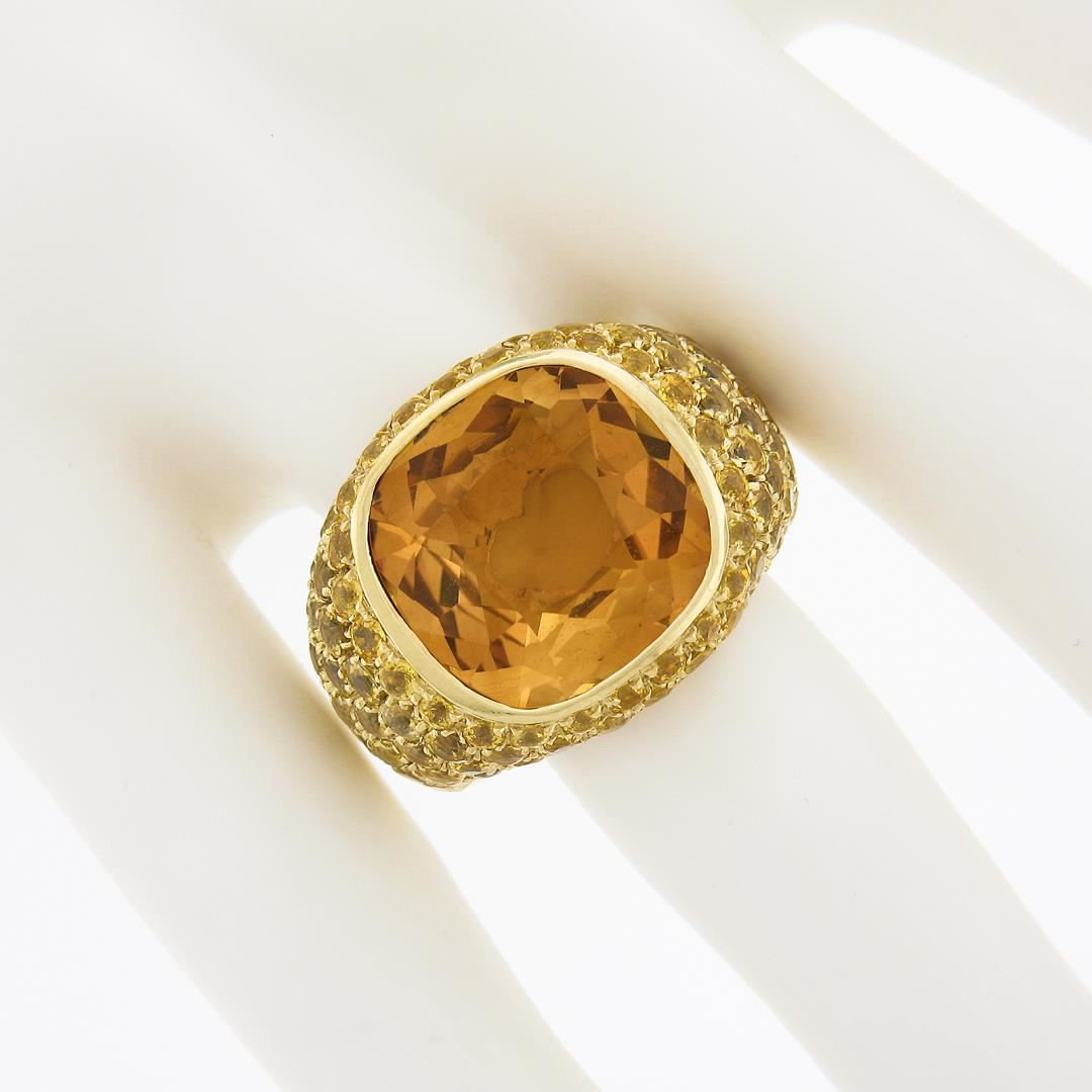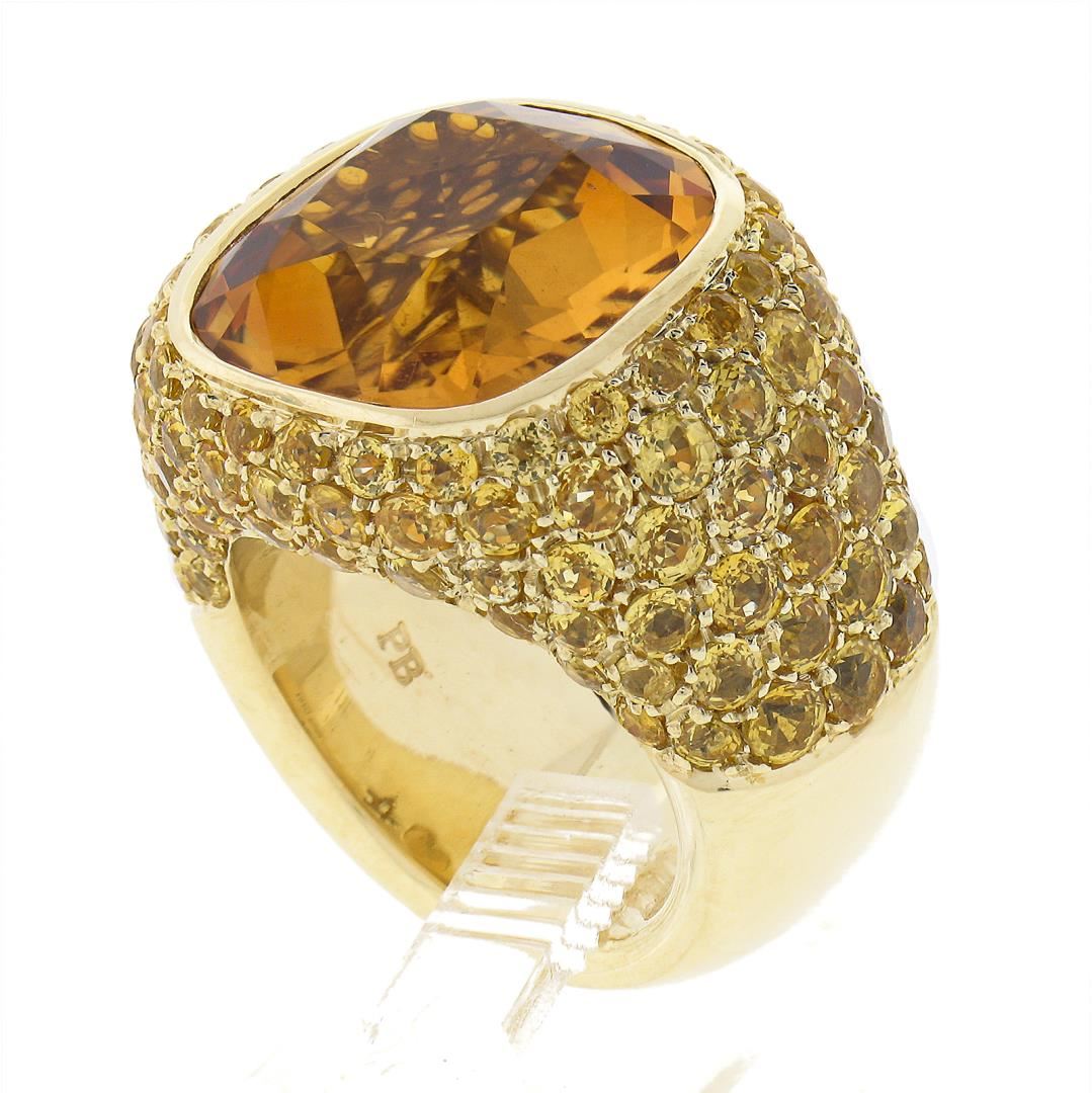 A solid 18k yellow gold cocktail ring by Pasqual Bruni, with 1 Large cushion cut natural citrine (10ct), and numerous of round cut natural yellow sapphires (5-6ctw). The ring is size 6.0, weighs a total of 24.33 grams, and measures 18.4mm wide.