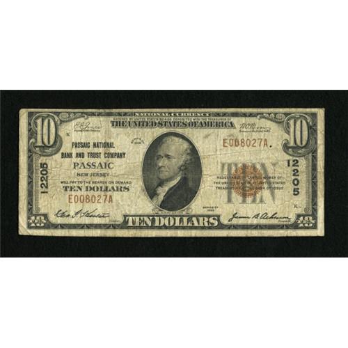 <B>Passaic, NJ</B></I> - $10 1929 Ty. 1 <B>Passaic NB & TC</B></I> Ch. # 12205<BR> Light soiling remains as a testament to the circulation sustained by this note. <B>Very Good</B></I>.<BR><I>From The John Ameen Collection</B></I><BR><BR><b>Shipping:</b> Coins & Currency (<a target="_blank" href="http://www.heritageauctions.com/common/shipping.php">view shipping information</a>)
