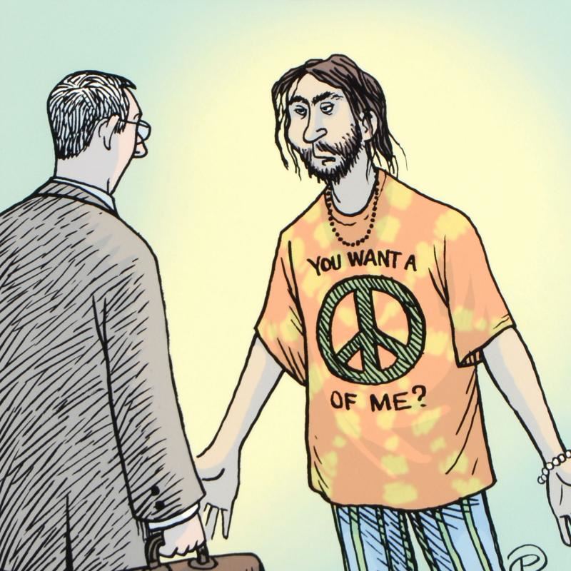 Enter a surreal and satirical world of twisted imagination and award winning creativity. "Passive Agressive Hippie" is a limited edition giclee on paper by Dan Piraro, creator of the critically acclaimed and award winning comic strip, Bizarro! This piece is framed, numbered and hand signed by the artist! Includes Certificate of Authenticity! Measures approx. 17" x 19" (with frame), 9.5" x 11.5" (image).