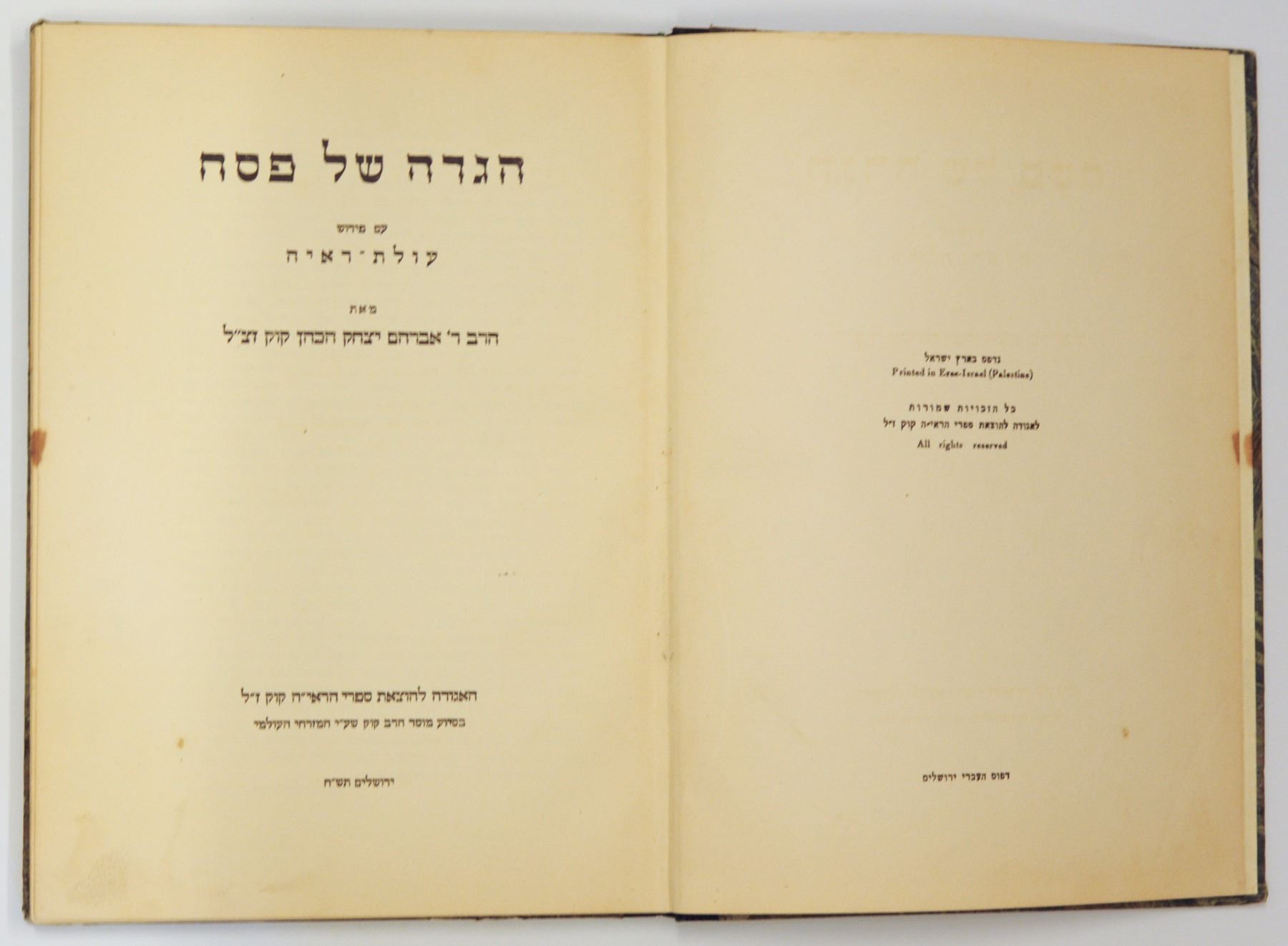 Passover Haggadah, with Olat Reiya commentary by Rabbi Avraham Yitzchak HaCohen Kook, first edition, published by Hareiya Kook Books, Jerusalem, 1948. Hardcover, 63 pp., thick paper. With introduction by his son Rabbi Zvi Yehudah HaCohen Kook. Haggadah Thesaurus 4079. Overall in good condition: some foxing, reasonable yellowing.