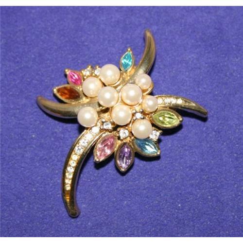 A beautiful array of sparkling Pastel colored Navettes Rhinestones, intermixed with Chaton Rhinestones and large white glass pearls make up this classic vintage Brooch or Pin. All stones are set in paste fashion in a shinny gold plated metal. Overall measurements of this fabulous vintage Brooch is 2 ½ inches long by 2 inches wide and ¾ of an inch deep. Securing with a long pin stem and safety catch closure, weighty and very well made.