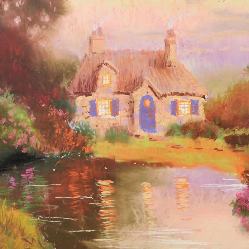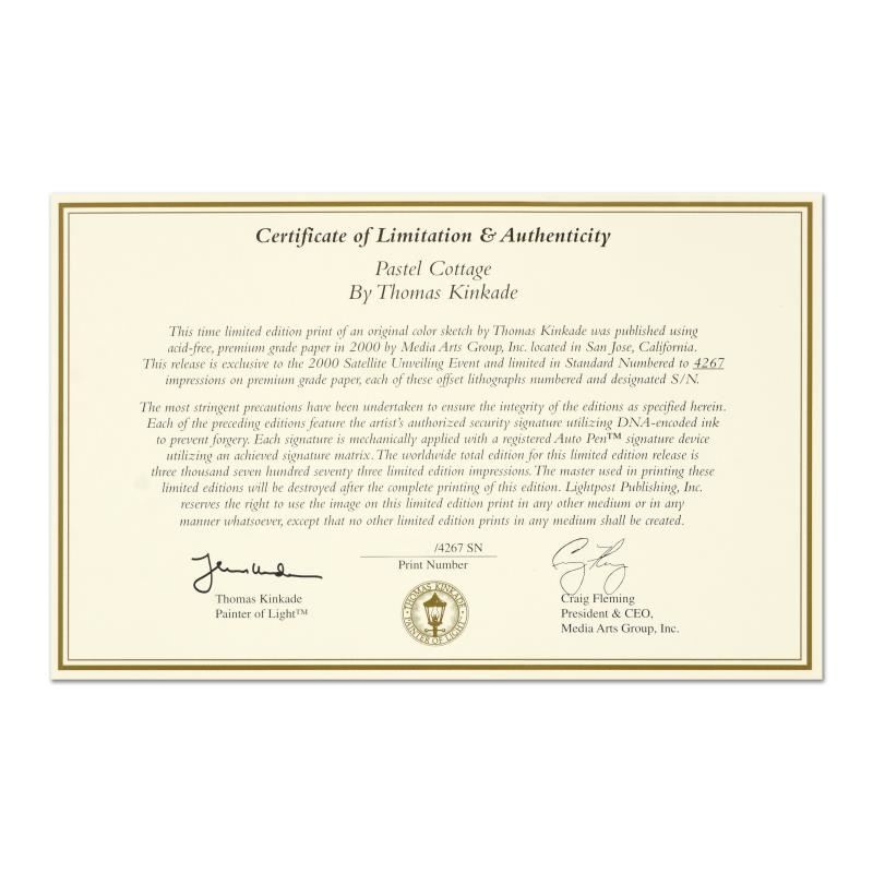 "Pastel Cottage" is an Offset Lithograph on paper by Thomas Kinkade (1958-2012), numbered and bearing Kinkade's authorized signature. Includes Letter of Authenticity from Lighthouse Publishing. Measures approx. 20" x 16" (border), 16" x 12" (image).