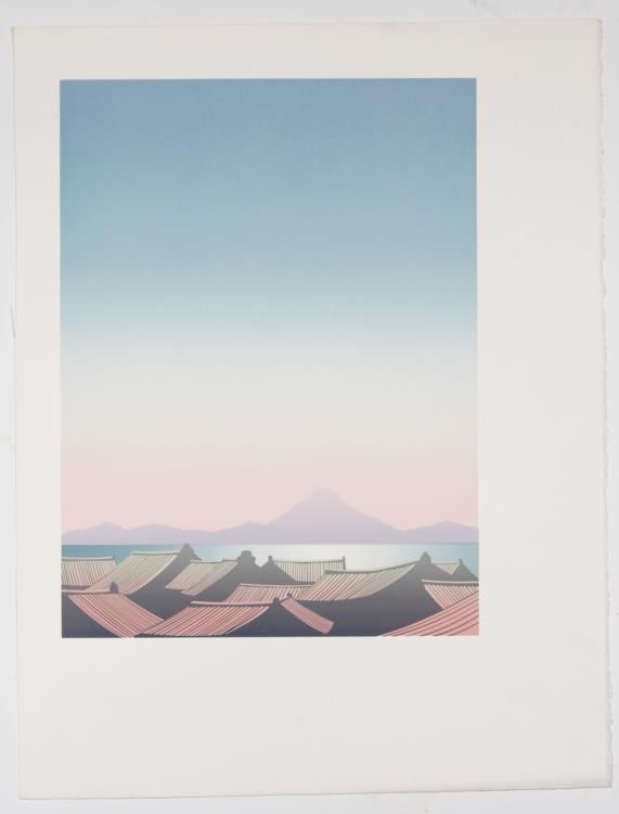 Up for sale is a Pastel Japanese Rooftop Landscape Print by an Unknown Artist. The print measures 20.5" x 26.5".