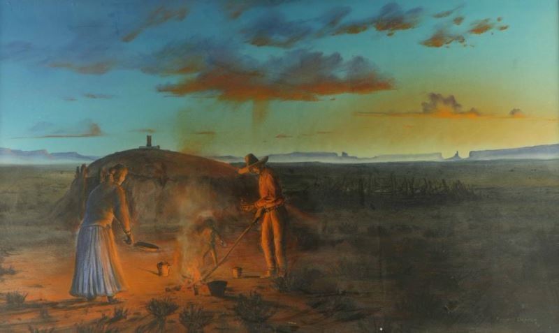 Signed lower right, depicting a family by the campfire in front of their desert home. Image measures 23 1/2"x39 1/2" in copper and black wood frame Born in Canyon del Muerto, New Mexico, Robert Draper is from the Navajo-Laguna Pueblo. Mainly self-taught, he has worked as an art instructor at the Chinle Boarding School and settled in Chinle. He paints realistic watercolor landscapes and genre of the Navajo Reservation. A favorite subject is Canyon de Chelly.