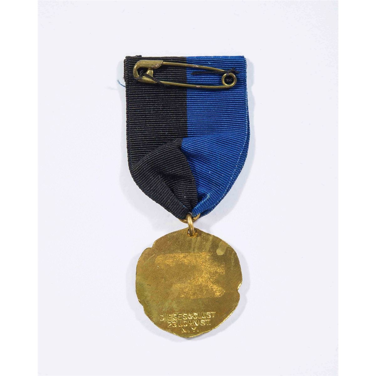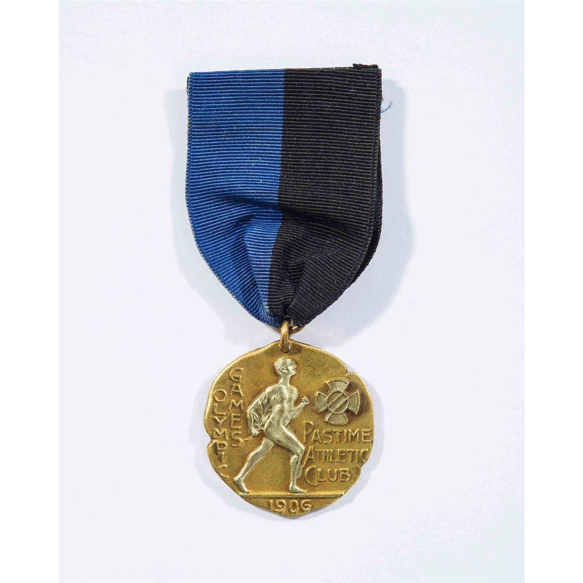 A 1906 Pastime Athletic Club medal, representing New York City. Gold-finished medal measures approximately 1? in diameter and is attached to its original blue and black ribbon for an overall length of 3.25?. Front of the medal bears a raised relief of a runner, with “Olympic Games, Pastime Athletic Club 1906,” in raised letters. Reverse is stamped by makers Dieges & Clust of New York. In extra fine plus condition.