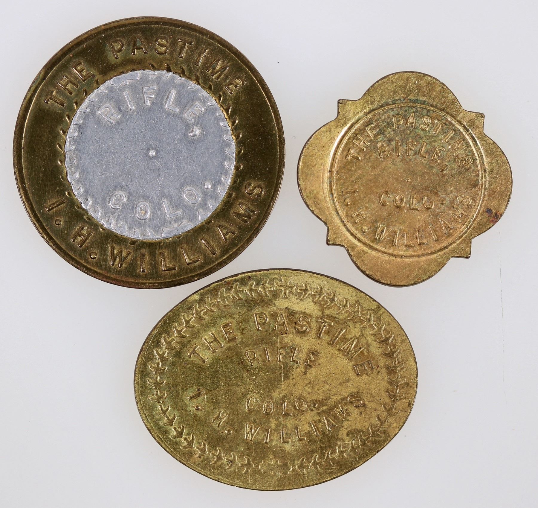 3) THE PASTIME / RIFLE, / COLO. / I.H. WILLIAMS // GOOD FOR / 25c / IN TRADE; Br., Sc 4, 30 mm.