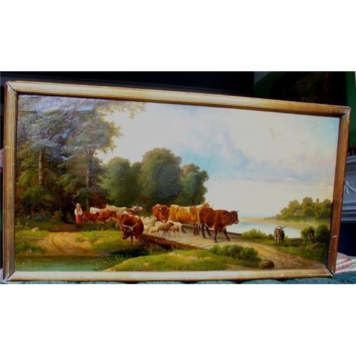 This very attractive and well-executed work is oil on canvas. (It has been relined.) The pastoral scene depicts a herdswoman in a bold red and white frock coaxing a herd of six cows and seven sheep across a planked bridge above a stream. One cow is descending into the stilled stream to drink. A goat stands and observes the scene just beyond the cattle, on the opposite side of the bridge, woods in the distance, with a pale blue sky filled with pink tinged clouds above. Signed "A. Koska" on lower left. Aniela Kostka, a Polish painter born mid-to-last quarter of the 19th century. The painting is in the original 2" wide ribbed gold gilded wood frame.