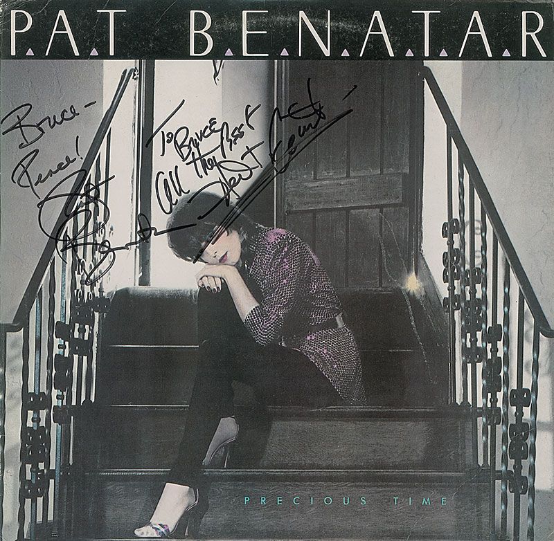 Precious Time album signed and inscribed on the front cover in black felt tip, “Bruce—Peace! Pat Benatar,” and “To Bruce, All the best, Neil Giraldo.” In fine condition, with some scattered creases and a light ‘ring of wear’ to front cover. The record is included. Accompanied by a full letter of authenticity from Roger Epperson/REAL and a letter of authenticity from James Spence.