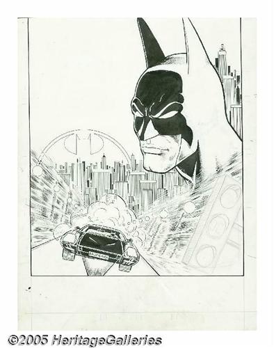 <B>Pat Broderick - Batman Splash Page Original Art (DC, undated).</B></I> Pat Broderick's moody montage of the Cowled Crusader patrolling the streets was most likely published as the inside front cover of an issue of <B>Detective Comics</B></I>. The splash was beautifully inked, except for a stop light at the lower right, which is still drawn in pencil. This light may have been left uninked for a special effect during the printing phase. The image area of the splash measures 10" x 12.5". The page was trimmed to the image at the top edge, and there is some edge wear; otherwise the art is in Good condition.