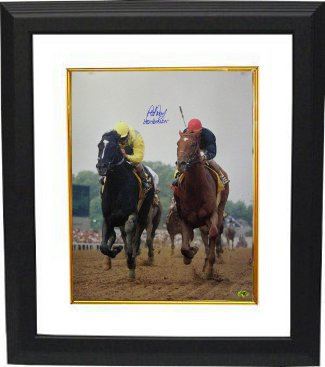 Easy Goer was an American Champion Hall of Fame Thoroughbred racehorse famous for earning American Champion Two-Year-Old Colt honors in 1988 and defeating 1989 American Horse of the Year Sunday Silence in the Belmont Stakes by 8 lengths. The victory deprived Sunday Silence of the Triple Crown. It was also the second fastest Belmont Stakes, behind only the record performance of Secretariat in 1973. Pat Day is a four-time winner of the Eclipse Award for Outstanding Jockey and was inducted into the National Museum of Racing and Hall of Fame in 1991. Day has ridden winners of U.S. Triple Crown races nine times. Day is also the all-time leading rider at Churchill Downs and Keeneland Race Course, the two largest tracks in his adopted home state of Kentucky. Pat Day has hand signed this Horse Racing 1989 Belmont Stakes 16x20 Photo Easy Goer vs Sunday Silence and has added the inscription, "Heartbreaker." An MAB Celebrity Services Hologram and certificate of authenticity from Athlon Sports. Custom White Mat and Premium Black Color Framed as shown.
