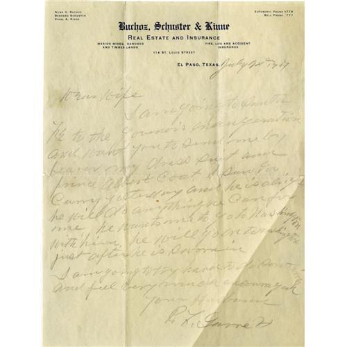 <B>Pat Garrett Autograph Letter Signed</B></I> "<I>P. F. Garrett</B></I>". One page, 8.25" x 11", real estate letterhead, El Paso, July 24, 1907, in pencil, to his wife. Pat Garrett is often referred to as "The Man Who Shot Billy the Kid." In part: "<I>...I am going to Santa Fe to the governor's inauguration and want you to send me by bearer my dress suit and Prince Albert coat. I saw Gov. Curry yesterday and he is alright. He will do anything he can for me. He wants me to go to Washington just after he is sworn in. I am going to try hard to do something and feel very much encouraged...</B></I>" George Curry was appointed Governor of New Mexico by Theodore Roosevelt and Garrett hoped that Curry might appoint him superintendent of the territorial prison in Santa Fe. Garrett never received the position, and less than a year later, was ambushed, shot, and killed near his ranch in New Mexico. Very good condition; folds.
