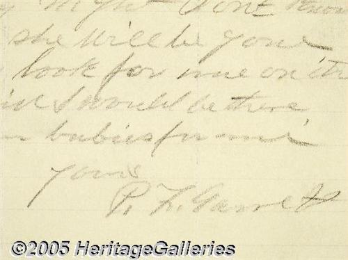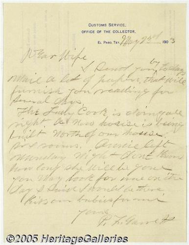 <B>Pat Garrett Handwritten Letter, 1903</B></I> A scarce Autograph letter signed, "P. F. Garrett," as Collector of Customs, 8" x 10", El Paso, Texas, May 23, 1903 in pencil to his wife. The lawman who shot Billy the Kid writes to update his wife on recent events, "Dear Wife, I sent you by today's mail a lot of papers that will furnish you reading for several days. The Lady cook is doing all right. As her house is being built North of our house six rooms. Annie left Monday night don't know how long she will be gone. You may look for me on the day I said I would be there. Kiss our babies for me yours P. F. Garrett." Pencil ever so slightly smudged, usual light creases, otherwise very clean and bright. Perfect for display in your Old West collection! <I>Accompanied by COA from PSA/DNA.</B></I>