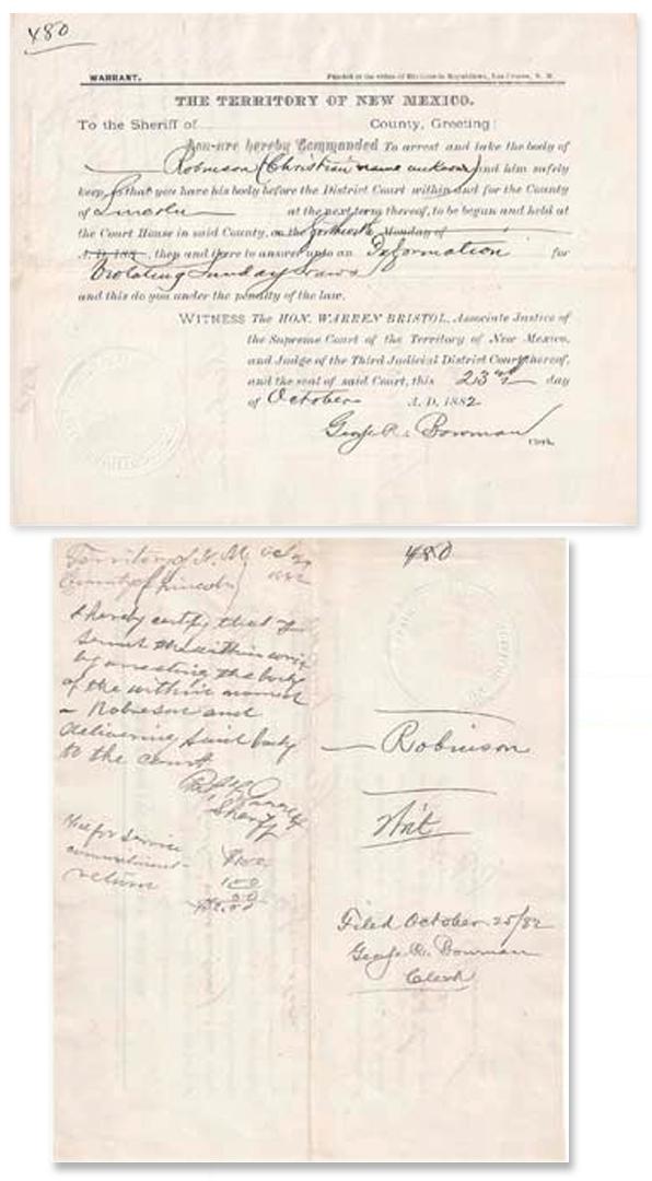 Very rare Pat Garrett signed warrant for the arrest of a ''Robinson (Christian name unknown),'' dated 23 October 1882. Lawman Pat Garrett gained notoriety in 1880 for the killing of his one-time friend, Billy the Kid. Here, Garrett, as Sheriff of Lincoln County, New Mexico, attests: ''I hereby certify that I served the within writ by arresting the body of the within named _ Robinson and delivering said body to the court. Pat F. Garrett / Sheriff.'' Warrant is on two pages, front and verso. Notary seal still intact. Near fine condition.