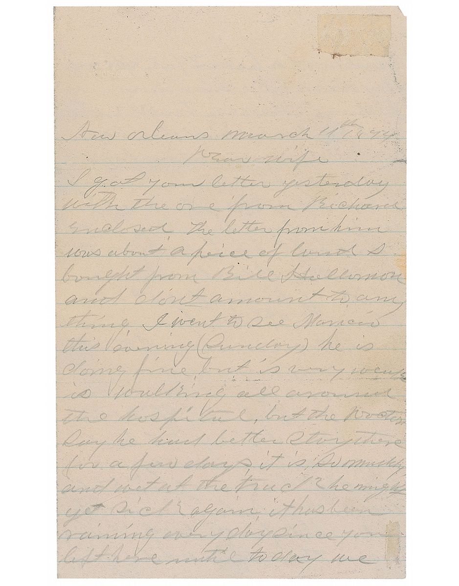 After his less–than–admirable killing of Billy the Kid turned much of the public away from him, Garrett moved his family from New Mexico to Uvalde, Texas to escape his tainted reputation and start fresh. He left law enforcement behind and focused his attention on developing new irrigation projects and raising the fastest horses in the west. Though incredibly successful at the latter, Garrett had a hard time finding real competition among the local ranchers; unable to make enough money racing against the occasional out-of-towner, he travelled with his best horses in search of solid bets. This letter, written from New Orleans in March of 1894, was likely written while preparing for the first annual Crescent City Derby—later renamed the Louisiana Derby—which continues to take place every year in late March. A deeply personal letter underscoring the financial struggles that the legendary lawman faced, and his passion for horses that he hoped could sustain his growing family.
