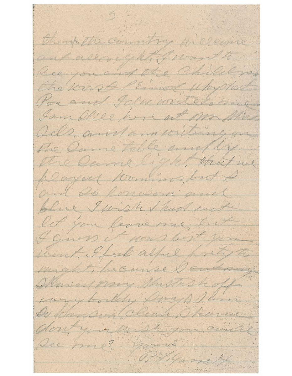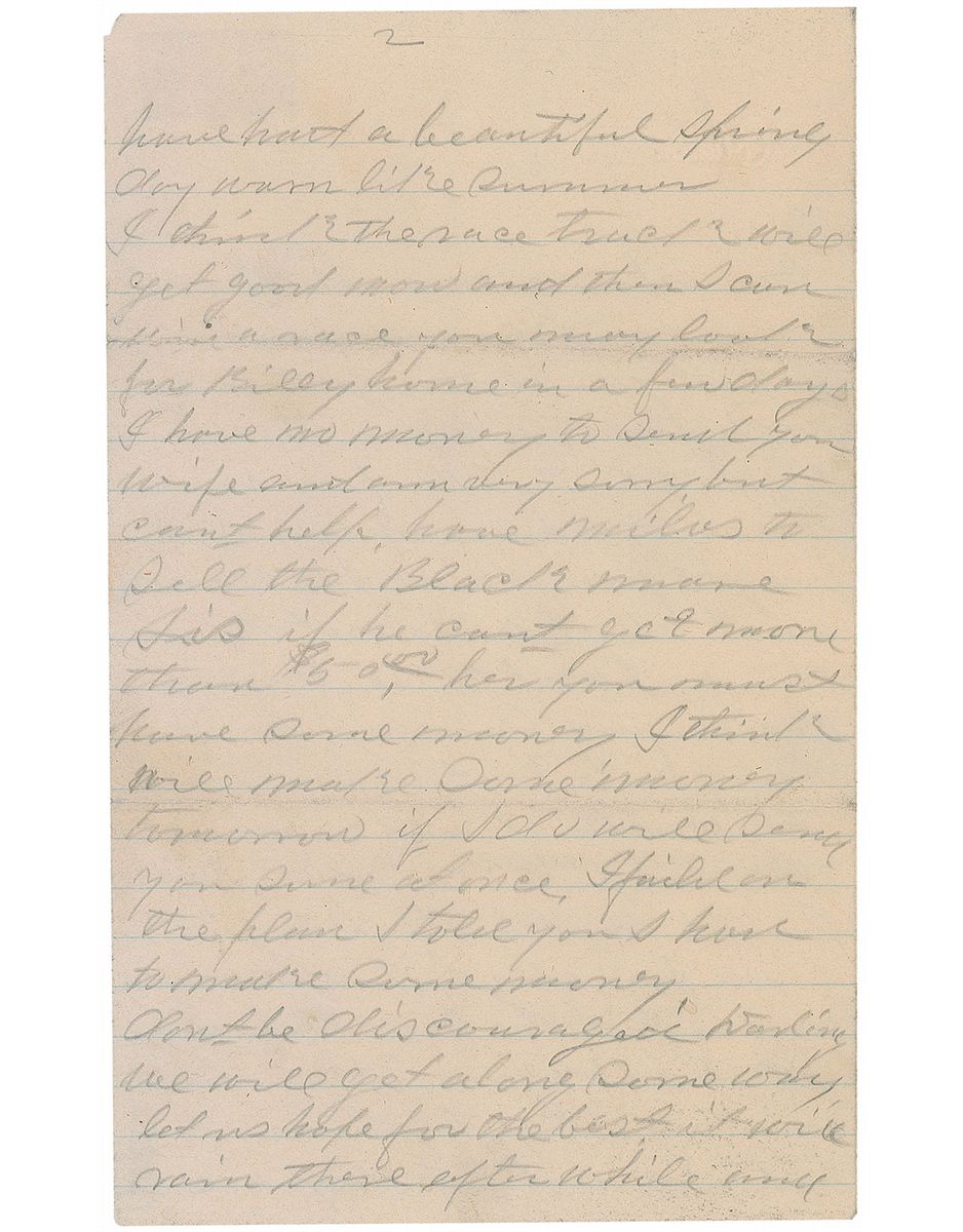 New Mexico lawman (1850–1908) who killed his former gambling partner, the fabled outlaw Billy the Kid, in 1881. In 1901 he was appointed customs collector in El Paso, Texas, where he served for five years before retiring. Garrett was fatally ambushed near Las Cruces; his suspected murderer, Jim ‘Deacon’ Miller, was never brought to justice. ALS, in pencil, signed “P. F. Garrett,” three pages, lightly-lined on two adjoining sheets, 5 x 8, March 11, 1894. Letter, written from New Orleans, to his wife. In full (with spelling and grammar retained): “I got your letter yesterday with the one from Richard enclosed. The letter from him was about a piece of land I bought from Bill Halloman and don’t amount to anything. I went to see Maricio this evening (Sunday) he is doing fine but is very weak is wandering all around the hospital, but the doctor say he had better stay there for a few days, it is so mucky and wet at the track he might get sick again. It has been raining every day since you left here until today we have had a beautiful spring day warm like summer I think the race track will get good now and then I can win a race you may look for Billy home in a few days I have no money to send you wife and am very sorry but can’t help. Have Milas to sell the black mare Sis if he can’t get more than $50.00 then you must have some money I think will make some money tomorrow if I do I will send you some at once. I failed on the plan I told you I have to make some money don’t be discouraged darling we will get along some way let us hope for the best it will rain there after while and then the country will come out allright I want to see you and the children the worst kind why don’t Pon and Ida write to me. I am still here at Mr. Minssels and am writing on the same table and by the same light that we played dominos, but I am so lonesome and blue I wish I had not let you leave me but I guess it was best you went I feel alful pretty tonite because I shaved my moustache off every body says I am so handsome clean shaven don’t you wish you could see me.” Garrett’s writing a shade light, but still completely legible, tape remnants to two corners of first and last page, and some light spotting to bottoms of interior pages, otherwise fine condition.