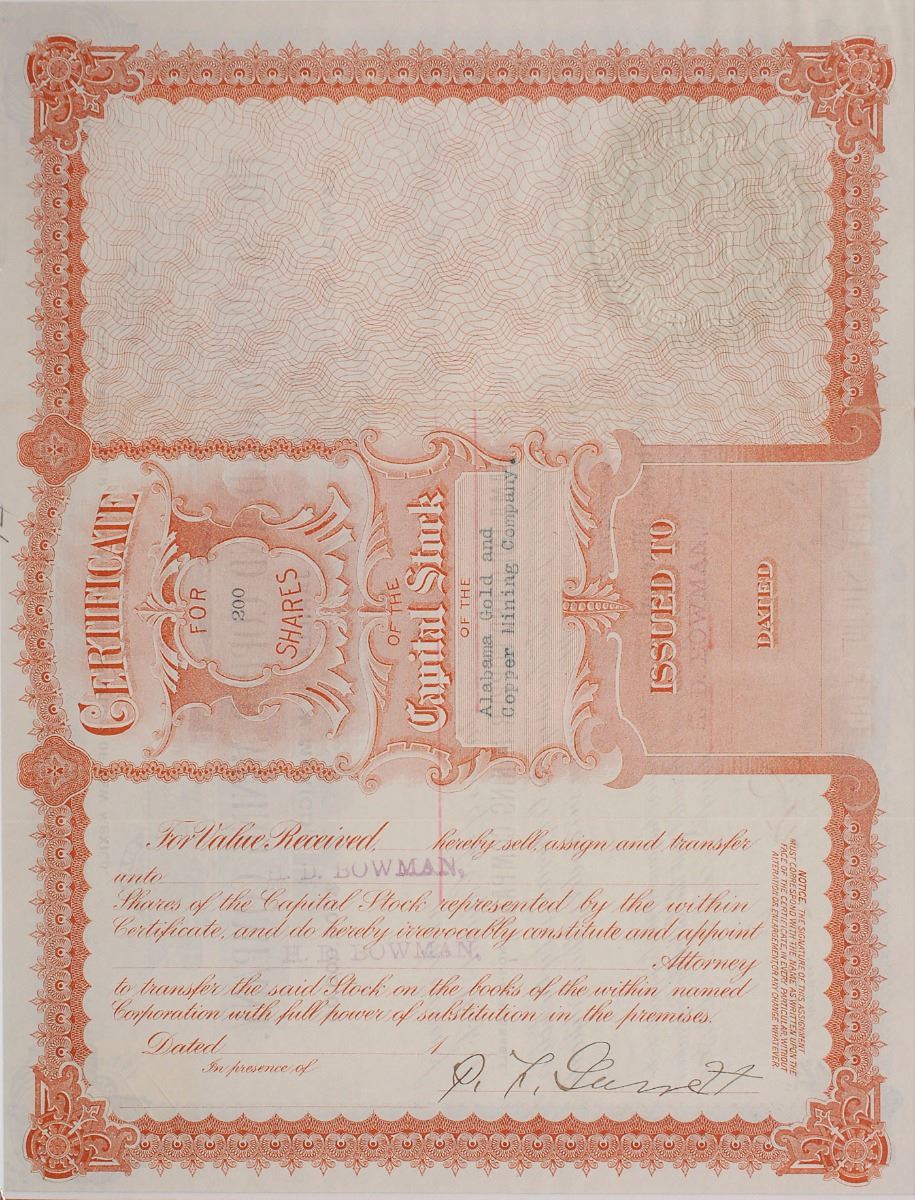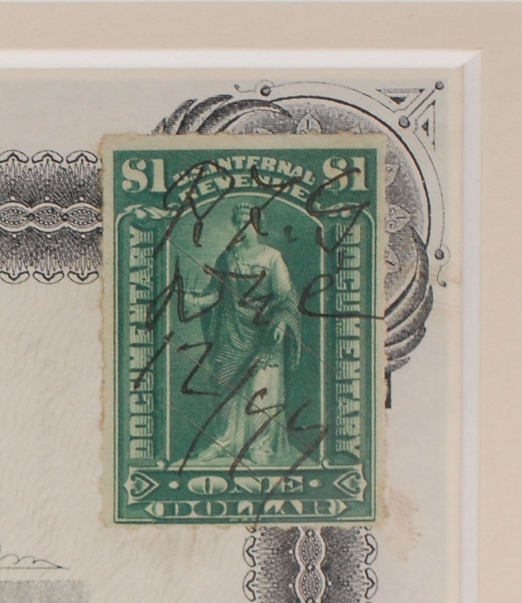 New Mexico lawman (1850–1908) who killed his former gambling partner, the fabled outlaw Billy the Kid, in 1881. Partly-printed DS, signed twice “P. F. Garrett” and once “P. F. G.,” one page both sides, 10 x 8, December 12, 1899. Certificate for two hundred shares of capital stock in the Alabama Gold and Copper Mining Company, issued to Pat Garrett himself, signed at the conclusion by Garrett as secretary and countersigned by J. M. Llewellyn as the company’s president. The one-dollar revenue stamp affixed to the upper right is initialed in Garrett’s hand, “P. F. G, Dec. 12/99.” Signed once more on the reverse by Garrett upon transfer of the stock to H. D. Bowman. The gold seal affixed to the lower left remains fully intact. Double-matted and framed to an overall size of 16.5 x 14.5, with a window in the backing for viewing the reverse. In fine condition, with expected document wear. Garrett’s signature is one of the most coveted of all Old West figures, and a document such as this—in fantastic condition and with three signatures—is of the utmost desirability.