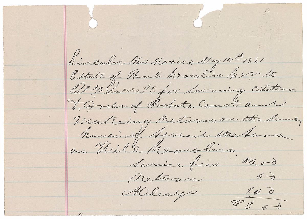 Third-person ADS signed within the text, one page, 8 x 5.5, May 14, 1881. Garrett writes out an invoice, in full: “Estate of Paul Dowlin here. to Pat F. Garrett for serving citation & order of Probate Court and makeing returns on the same, having served the same on Will Dowlin. Service fees $2.00, Return .50, Mileage 1.00, $3.50.” Endorsed on the reverse by James Tomlinson as probate judge and Ben Ellis as court clerk. In fine condition, with paper loss to upper margin. Accompanied by a beautiful custom-made leatherbound presentation folder. Provenance: Warren Anderson, 1996. Captain Paul Dowlin and his brother Will built Dowlin’s Mill in Lincoln County, New Mexico, in 1868, which operated as a grist and saw mill, blacksmith shop, general store, and post office; Paul Dowlin was shot dead by a disgruntled employee in 1877. Nevertheless, it remained a neutral site during the Lincoln County War and enjoyed visits from the colorful characters on both sides—both Pat Garrett and Billy the Kid were known to frequent the mill. This autograph document dates to just two months before Garrett tracked down and killed Billy the Kid.