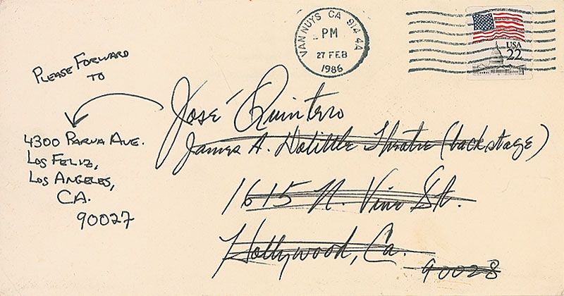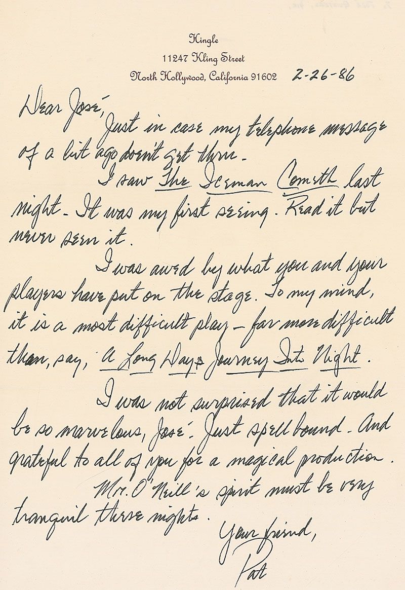 American actor (1924–2009) known for his appearances on The Twilight Zone and in Batman movies. ALS signed “Pat,” one page, 7.25 x 10.5, personal letterhead, February 26, 1986. Letter to theatre director Jose Quintero. In part: “I saw The Iceman Cometh last night…I was awed by what you and your players have put on the stage. To my mind, it is a most difficult play—far more difficult than, say, A Long Days Journey into Night.” In fine condition. Accompanied by the original mailing envelope, filled out in Hingle’s hand.