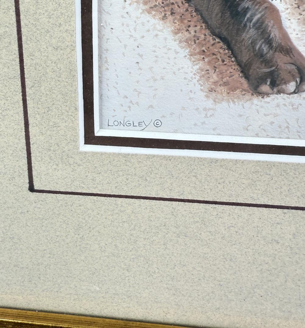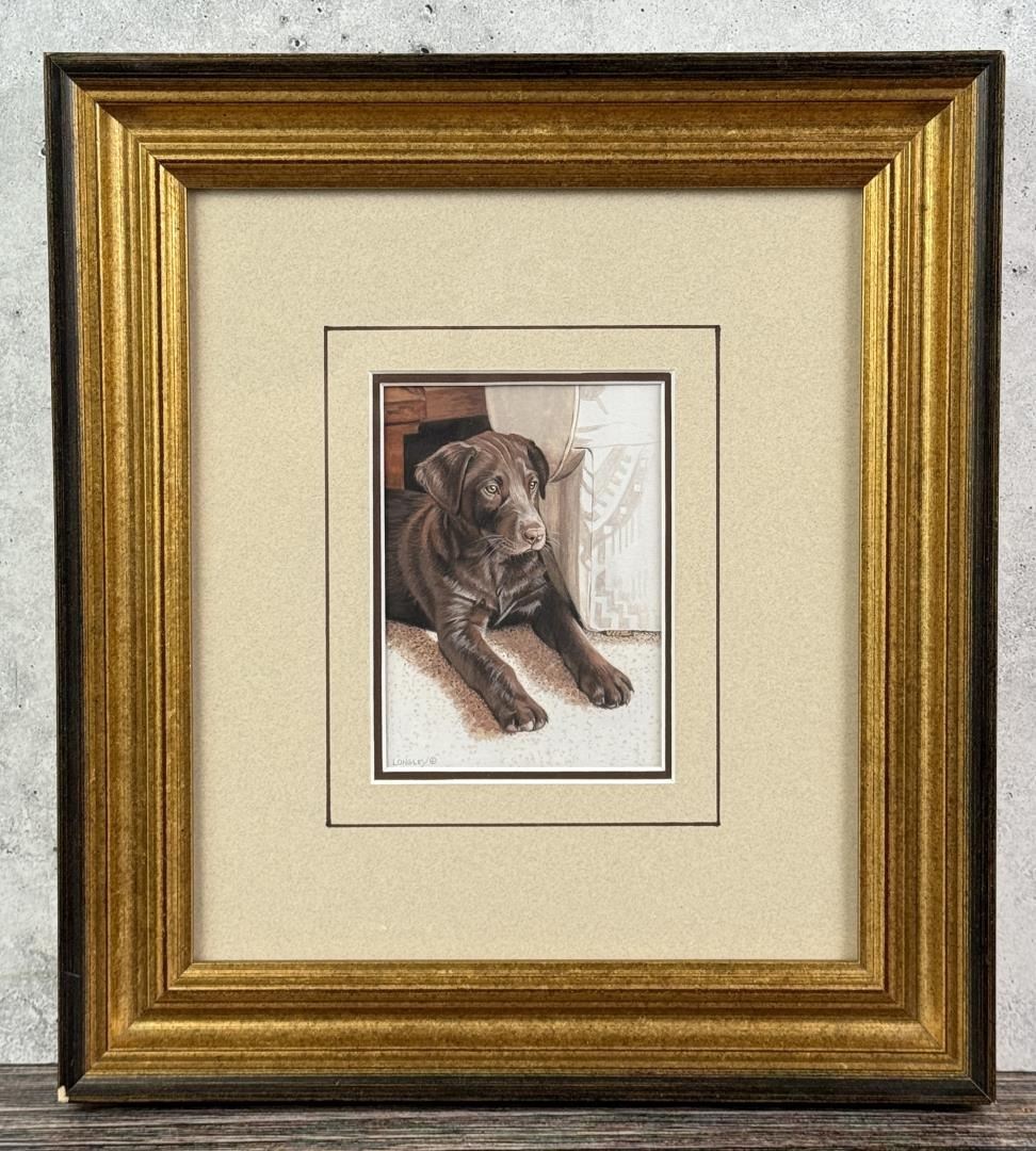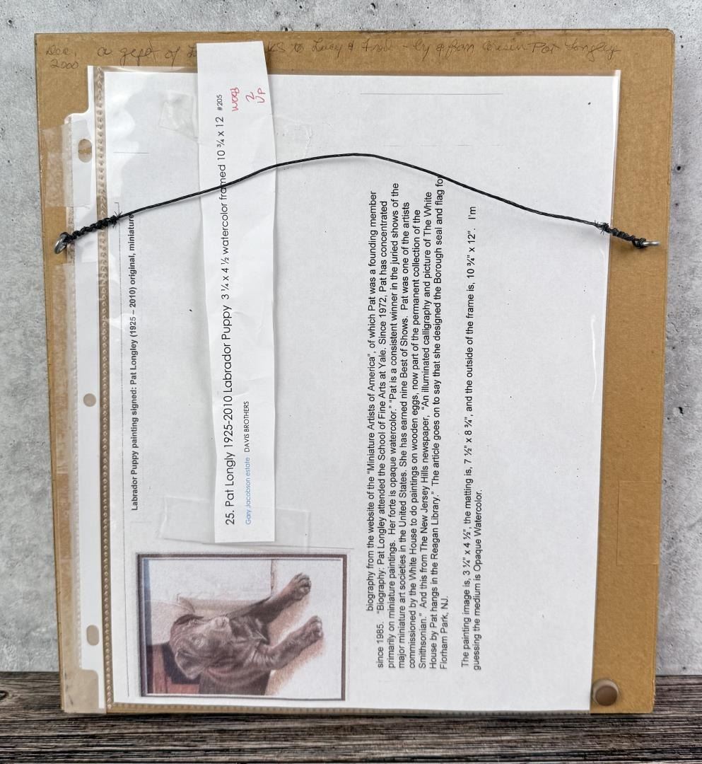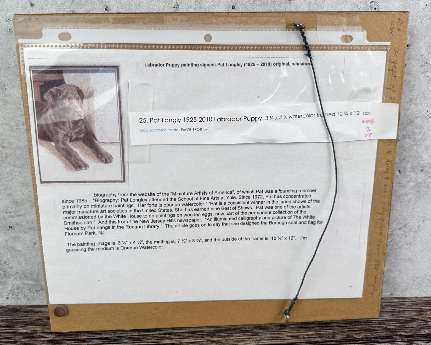 Title is Labrador Puppy. 3 1/2" by 5" unframed. 10 5/8" by 12" framed. Gouache on Board. Pat Longley (1925 - 2010) was active/lived in United States. Pat Longley is known for Painting. Patrice Crommelin Longley b. March 18, 1925 d. December 7, 2010 m. June 20, 1947 to Dwight Francis Longley Pat was the youngest of two children born to Paul Gifford Crommelin and Florence (Florie) Louise Austin. Her older brother Paul, Jr. was someone she always looked up to, a well-trusted and good-humored older brother. From an early age, Pat showed her zest for life and relationships, and disinterest in book learning. It's not that she was a bad student. To the contrary, she was always able to perform well, as long as she could do a drawing or picture as a part of her assignment. Her love for art began early, influenced in no small part by her grandfather Edwin Crawley (2nd husband to her grandmother Crommelin), who had an aptitude in hand drawing, and who gave her positive encouragement. Growing up in the era of the great Walt Disney, she painstakingly and faithfully replicated many of his early cartoon characters, including Mickey Mouse, Donald Duck, and Bambi. Pat's love for art matured and then followed her to college. She attended Salem College in Winston-Salem, North Carolina. There she applied her skill, making paintings and sketches for all her subjects--on the principle that a picture is worth a thousand words, and maybe an A. During her second year she was summoned to have a meeting with the Dean. His message was direct. "Pat. Let’s be realistic. You are a terrific artist, but you don’t seem to have much interest in learning math, science or Spanish. Why don’t you study art?" Considering this sage advice, Pat applied to and was accepted at the Yale School of Art--this at a time when the Ivy League schools were all male, and no less difficult to enter as they are today. There at Yale, Pat poured herself into the study of art, honing her skills in all media from sculpture to life drawings to painting. She even took faithful notes in her art history classes, proving that if the subject was of interest, she was indeed a good student. It was there at Yale that she would meet her husband, Dwight Longley. Dwight was returning home from his WW II service in the Army Air Corps on the same troop train as a young discharged naval officer, Paul Crommelin. The two struck up a conversation and soon found out that their parents were neighbors, in Madison, New Jersey--and that Paul had a little sister that Dwight might just like to meet. In those days, Pat would send her laundry home to be cleaned--from New Haven via train. It was on the excuse of returning her clean clothes that Paul, with new friend, Dwight, in tow, would go to Yale to find Pat. For Pat and Dwight, their meeting was love "at first sight." They became engaged within a month. But on advice from Pat's parents, the two waited a year to be married--an event that took place the following June at Madison Presbyterian Church in Madison, New Jersey. By the mid-1950's, after the birth of three children, Pat's love for art re-emerged. She painted stage sets for the Florham Park Players, hand lettered 8th grade diplomas for Ridgedale School, drew charcoal portraits of her children, then of the children of all her friends. Each year she made Christmas cards, tight little pen and ink drawings. This led to more pen and inks for friends--their houses, historic houses in town (as a member of the Historic Society), then the Little Red Schoolhouse and the Florham Park (New Jersey) borough logo. Soon her reputation spread to a young realtor who thought that a pen and ink of a house would be a nice touch--a gift to those who purchased one of his listings. Jim Weichert was in his late twenties then, and Pat had the pleasure of drawing many houses for him. Alas, Jim soon was selling so many houses that Pat couldn’t keep up with the volume. His idea seemed to be working. From there Pat got into new crafts--first illuminated calligraphy, which led to miniature paintings, which led to scrimshaw. All this she did with a passion for excellence, needing always the right colors, the right tools, insisting always on the best framing to properly show off her work. In all these labors Pat's talent grew, ever climbing to new heights, awards and recognition. An egg she painted is in the collection at the Smithsonian Institute in Washington, DC. An illuminated calligraphy and picture of The White House hangs in the Reagan Library. And over the decades that followed, Pat made new acquaintances in the art community as she looked forward to the many shows that displayed and sold her art. With each piece she displayed or had published in the newspaper she enhanced her reputation. And with each piece she sold she made a new friend. She painted to show her love and to be loved, and much love came to her. In all she would win seventeen different awards for her art, and would help to establish the Miniature Art Society of America, New Jersey and others. During this prolific period, her work was displayed in galleries in Arizona, New Jersey, Florida and, last but not least, on her beloved vacation isle, Nantucket, Massachusetts--where she and Dwight spent twenty eight Septembers. Dwight passed away February 10, 2005, and Pat entered a difficult and lonely period of her life. With failing eyesight, her ability to generate tight little, amazingly photographic, art became impossible. But during that time she continued to give away from out of her massive treasure of art--originals drawings, scrimshaw, and many of her prints--all that she had stored up over six decades of incredible productivity. Then, on December 7, after struggling with cancer, she followed her husband in death. Pat left behind three children, Janice Wentworth (Longley) Kapferer, James Dwight Longley, and Peter Gifford Longley; together with nine grandchildren and ten great-grandchildren.